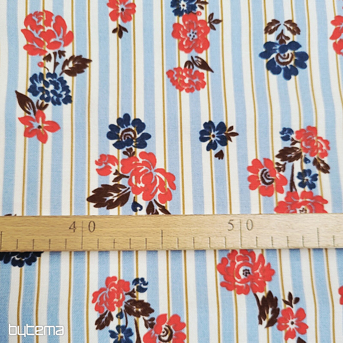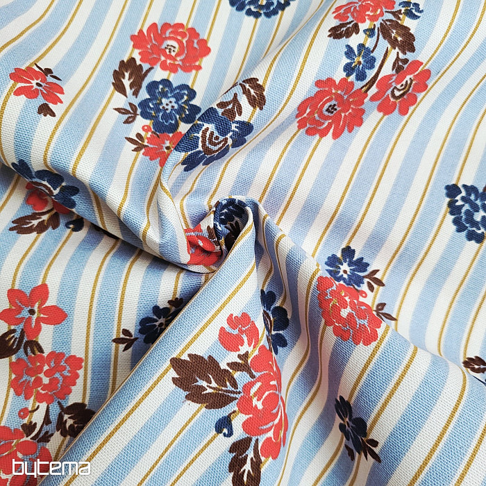 Der Stoff mit hohem Baumwollanteil (220 g/m²) und einem zarten Muster aus blauen und roten Blüten eignet sich hervorragend als dekorative Gardine oder Tischdecke für Ihr Zuhause. Die feinen Streifen verleihen dem Stoff zusätzliche Eleganz.