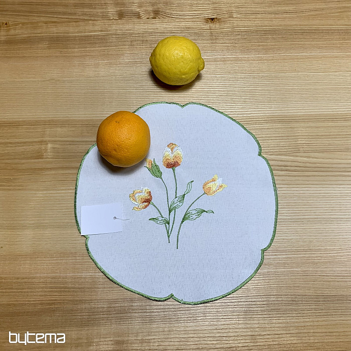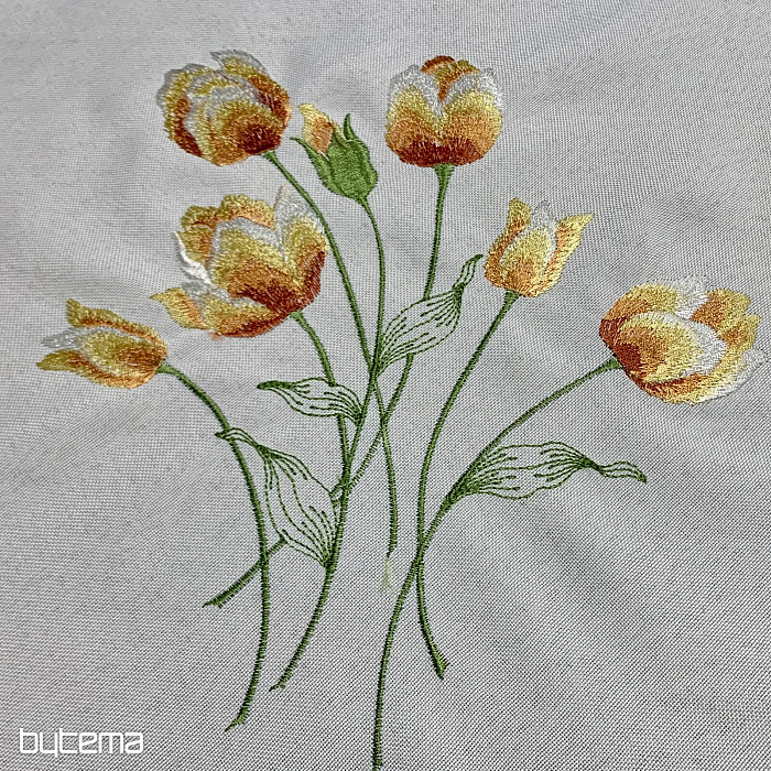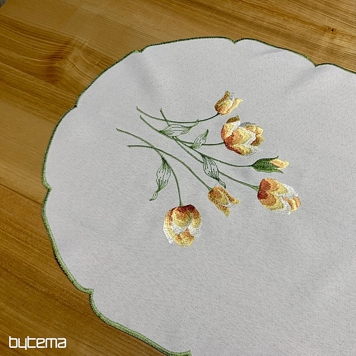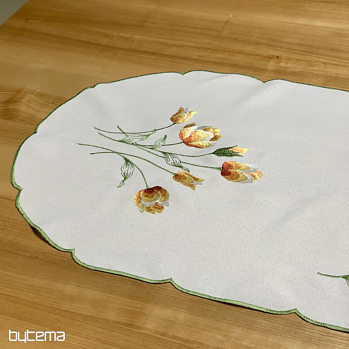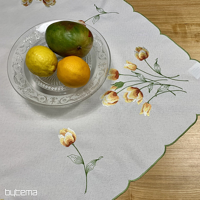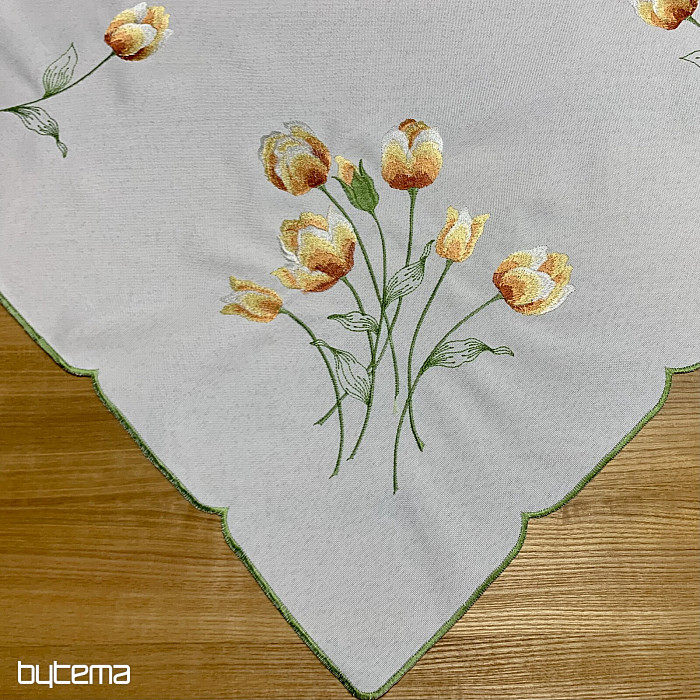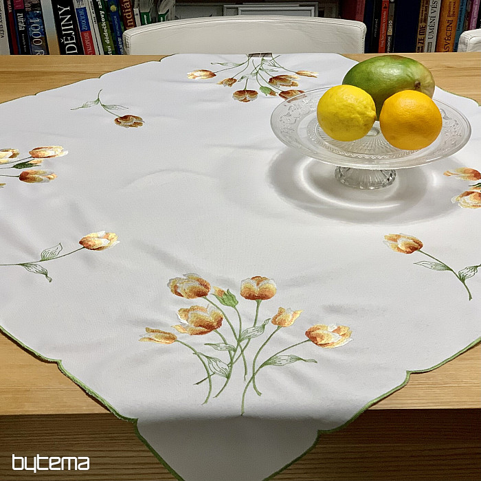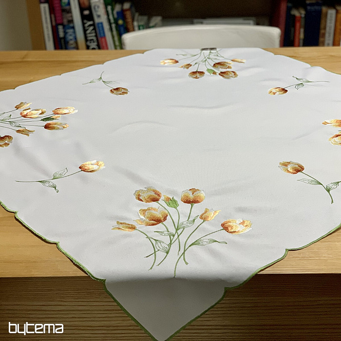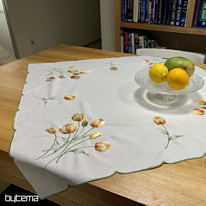 Bestickte Tischdecke und Schal mit einem Motiv aus orangefarbenen Tulpen, wunderschöne Stickereien beliebter Frühlingsblumen.