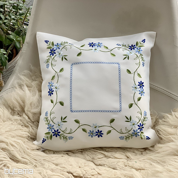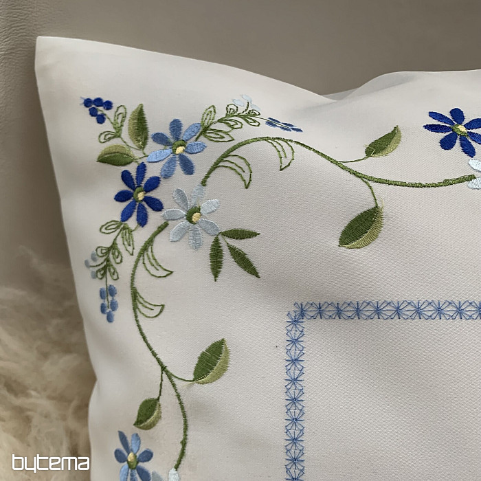 Zarter, bestickter Zierbezug mit zartem Vergissmeinnicht-Motiv.