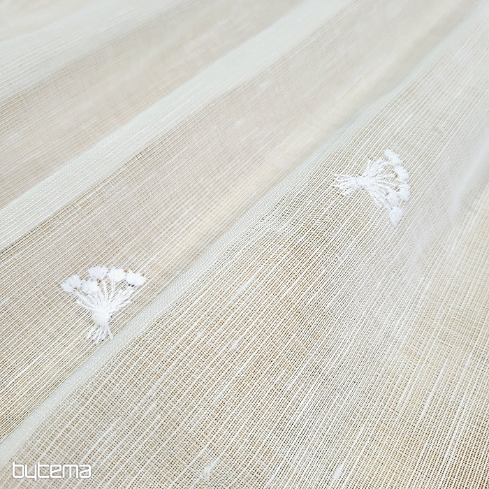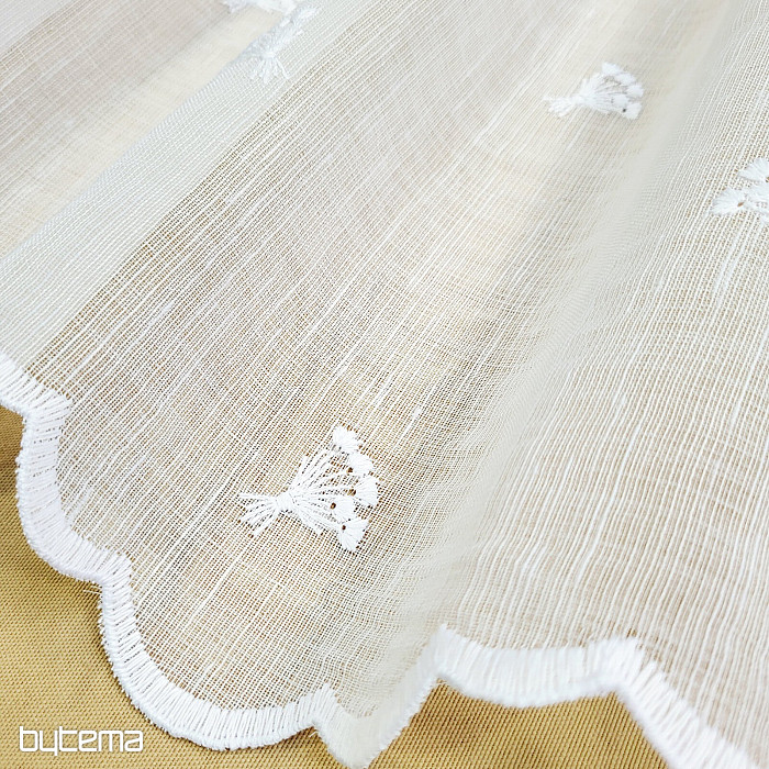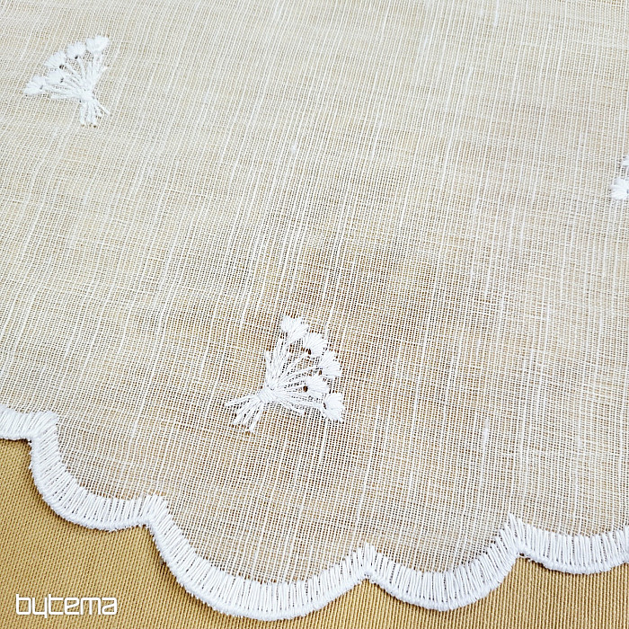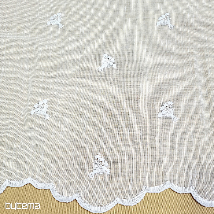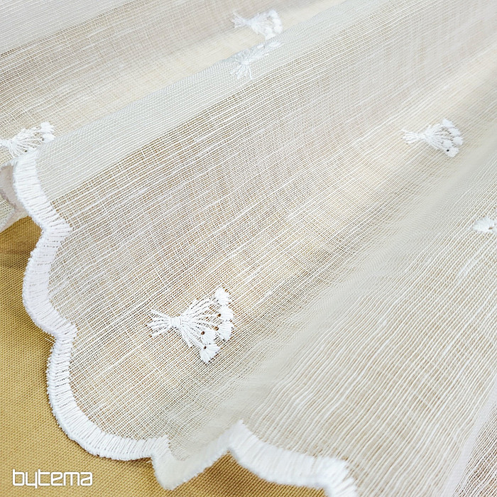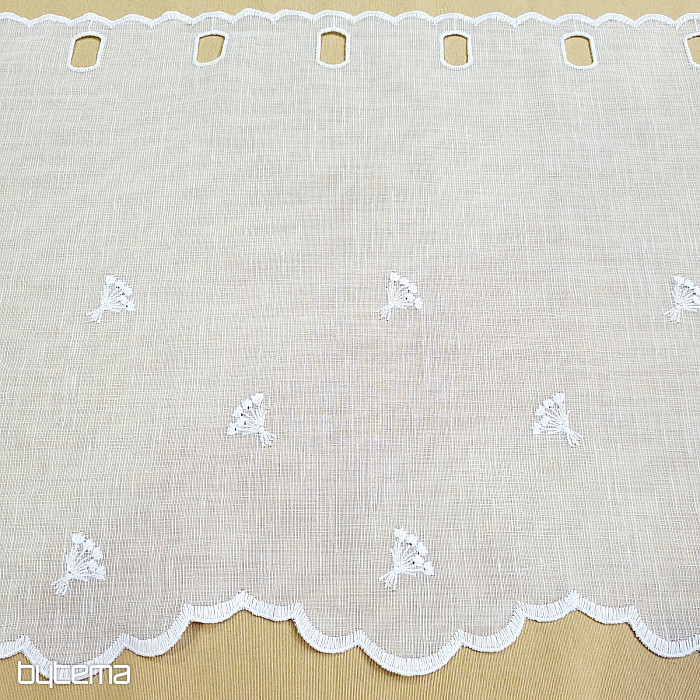 Wir bieten den Vorhang in drei Höhen an. Bei einer Höhe von 60 cm und 90 cm ist der Vorhang mit einer gestickten Blume in der Mitte versehen.