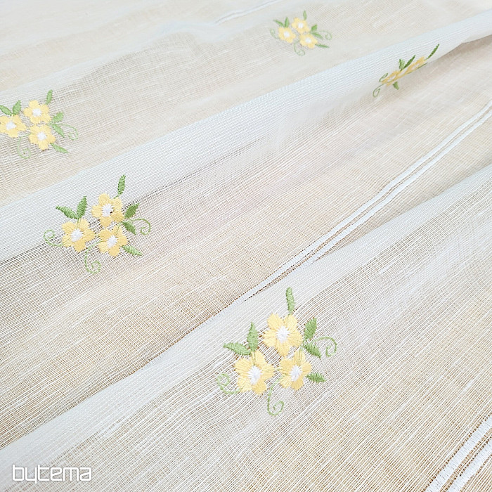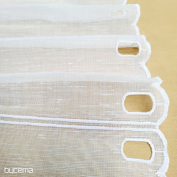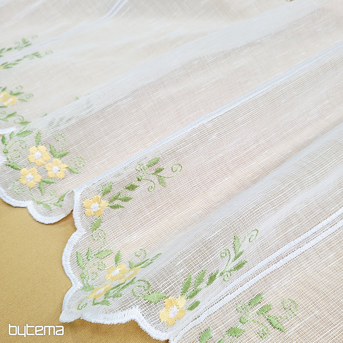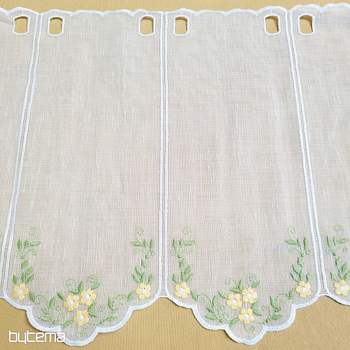 Wir bieten den Vorhang in drei Höhen an. Bei einer Höhe von 60 cm und 90 cm ist der Vorhang mit einer gestickten Blume in der Mitte versehen.