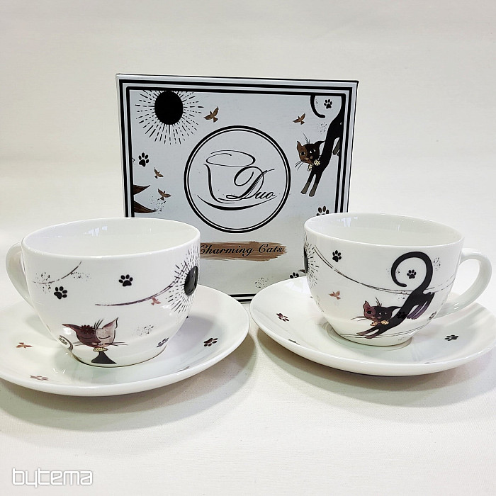 Zwei 280-ml-Tassen und zwei Untertassen sind aus Porzellan. Das gesamte Set ist in einer bedruckten Pappschachtel verpackt.