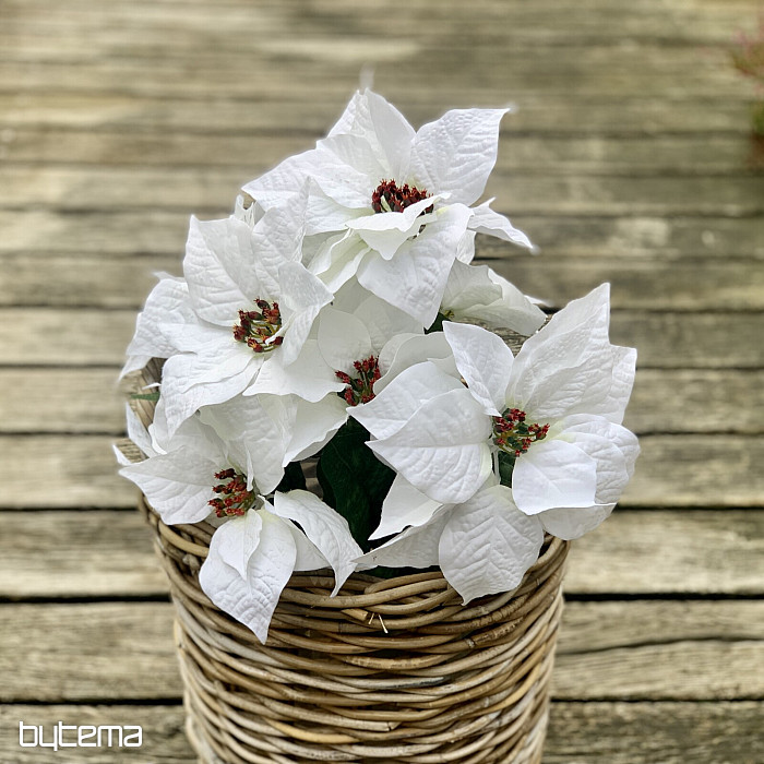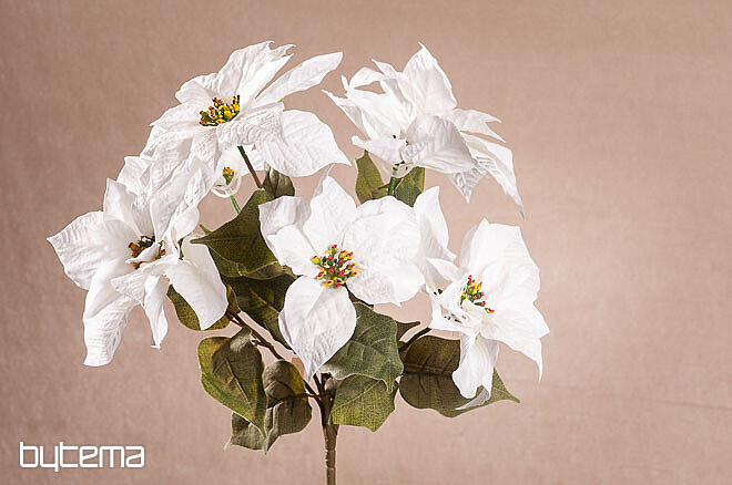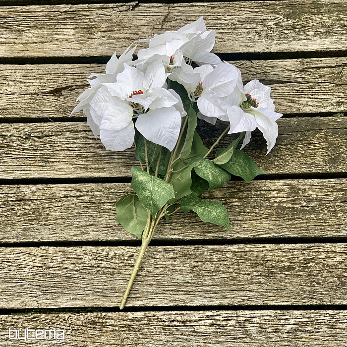 Ein großer Strauß roter Blumen in gelungenem Design. Sieben Blüten und viele Blätter bilden einen üppigen Strauß. Die Blume wirkt sehr natürlich und dank ihrer schönen Optik erhalten Sie eine eindrucksvolle Dekoration in der Weihnachtszeit.
