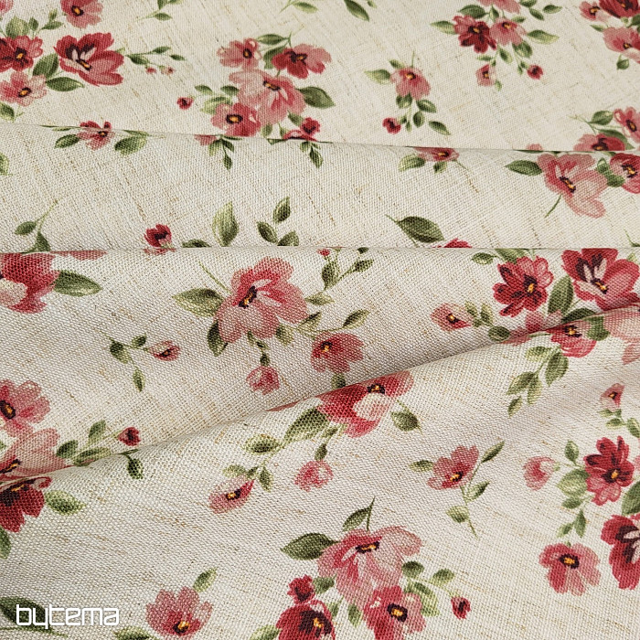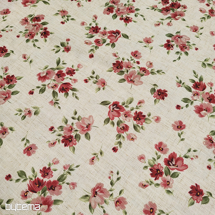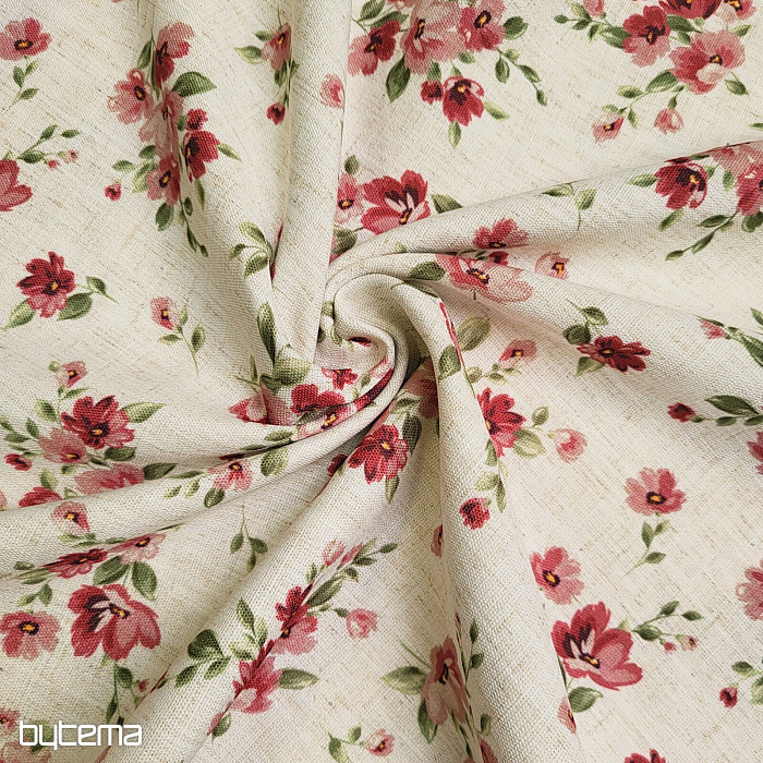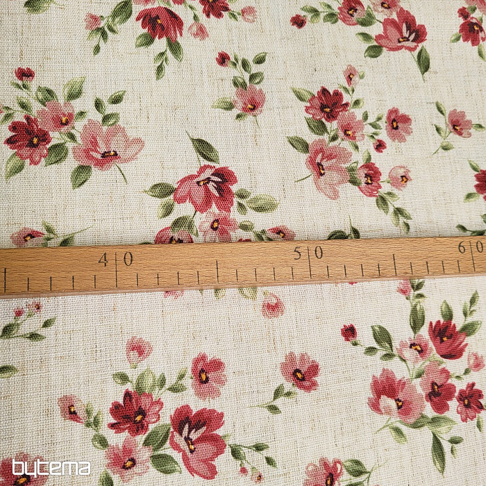 Dekorativer Stoff mit Frühlingsblumen in Dunkelrot schmückt Ihre Küche und Pergola.
