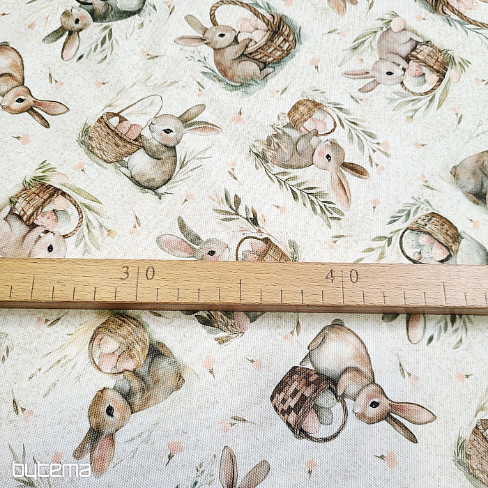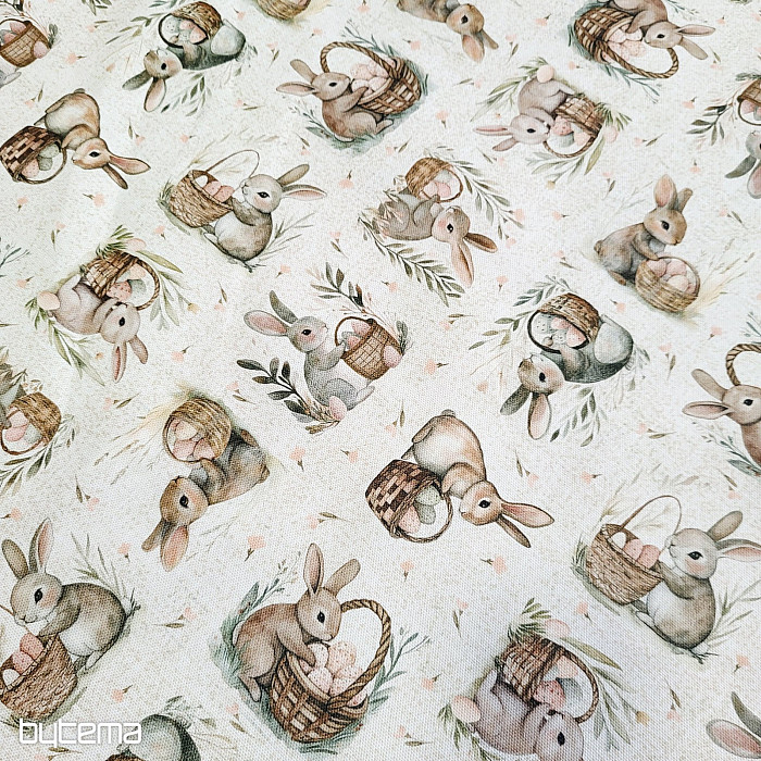 Osterdekorativer Stoff mit Hasen- und Eiermotiven. Eine wunderschöne und niedliche Dekoration für frühlingshafte Momente in Ihrem Zuhause.