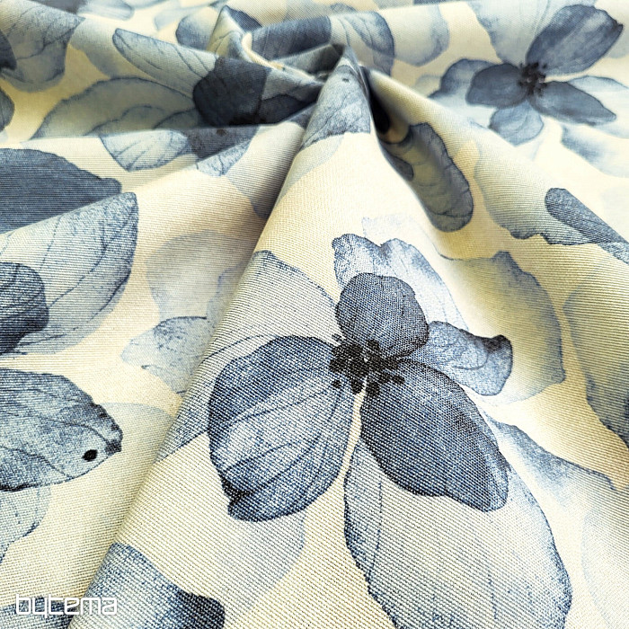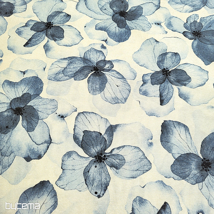 Dekorativer Stoff mit großen Blumen in Blautönen.