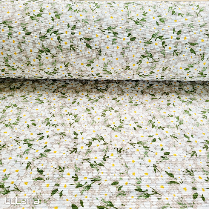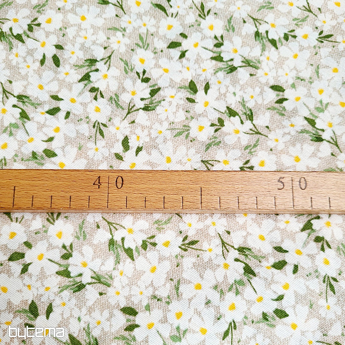 Dekorativer Stoff mit zarten weißen Blüten, die wie Gänseblümchen glänzen.