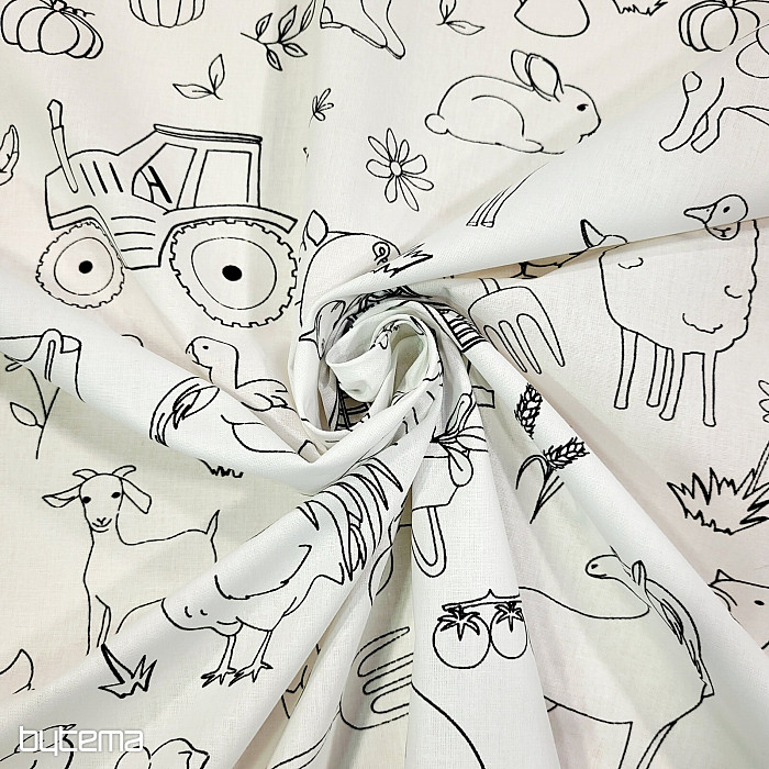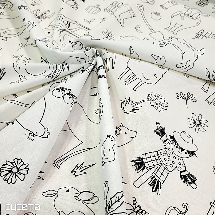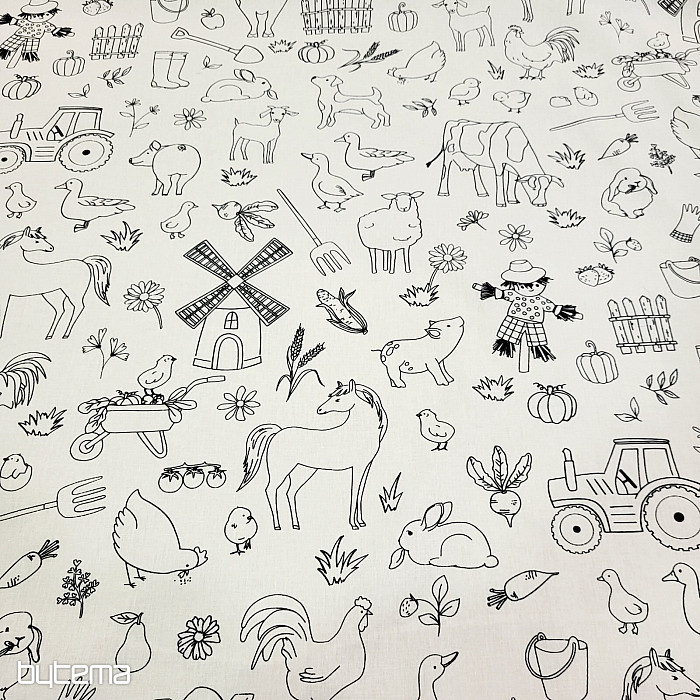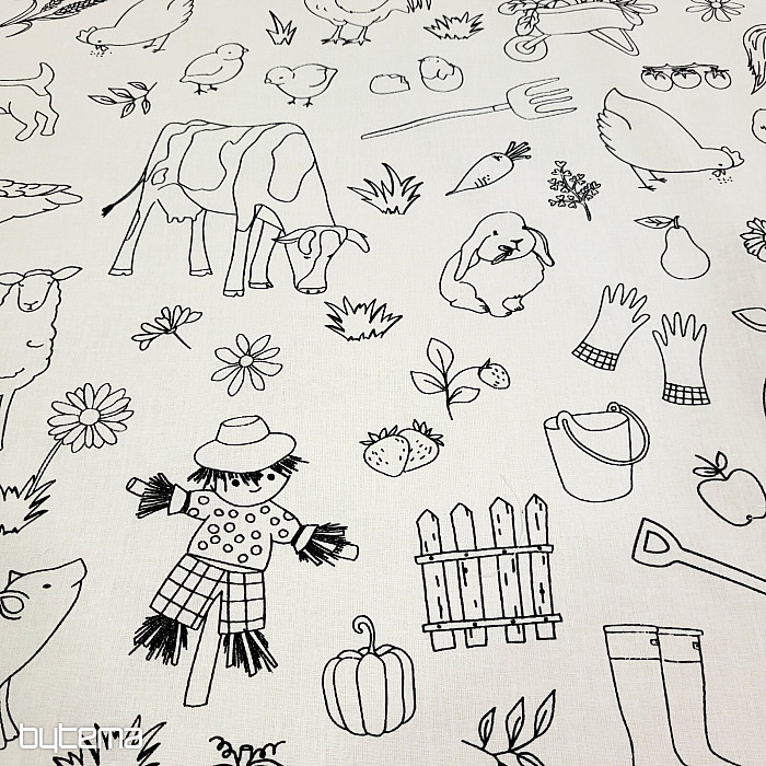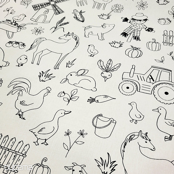 Ein Stoff zum Bemalen mit Bauernhoftieren, den Kinder nach ihrer Fantasie selbst ausmalen können.