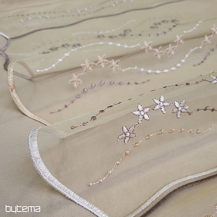 Kurzer, moderner, bestickter Vorhang in Buntglasoptik in Braun. Der braune Hintergrund und die gestickten Blumen verleihen dem Vorhang eine besondere Schönheit.