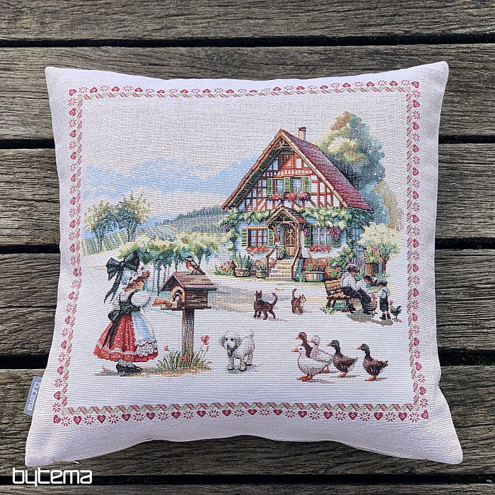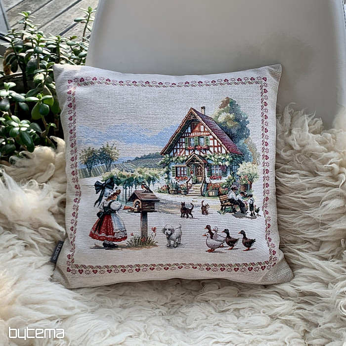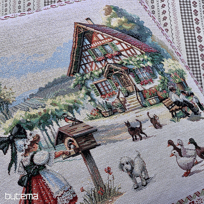 Kissenbezug mit Gobelinmuster und dem Motiv eines Landhauses mit einem Hof voller Tiere. Eine wunderschöne und poetische Dekoration für alle, die diese Landschaft lieben.