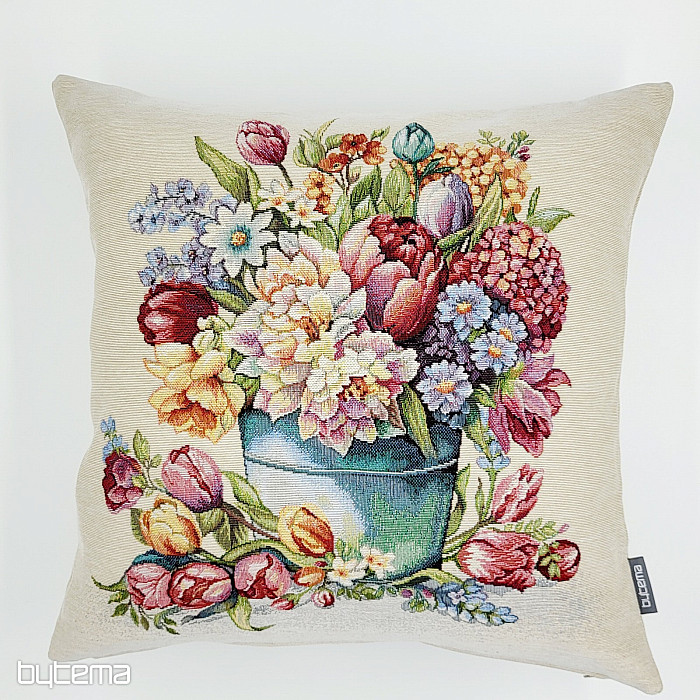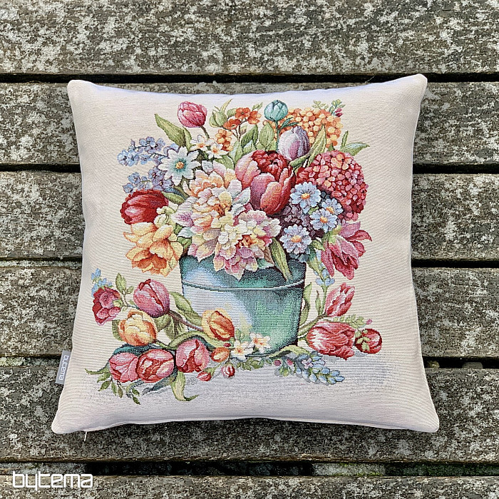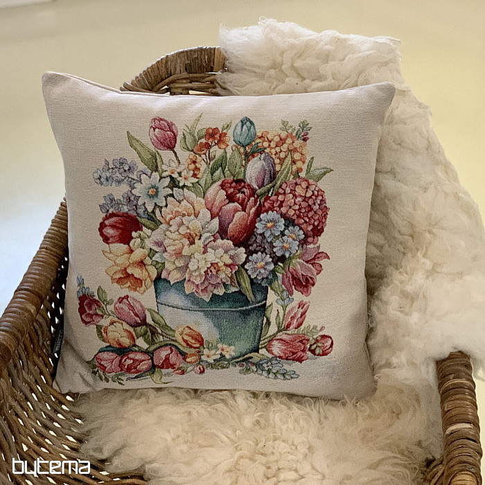 Ein Kissenbezug aus Gobelin mit Frühlingsfarben und Blumenmuster schmückt jeden Raum in Ihrem Zuhause.
