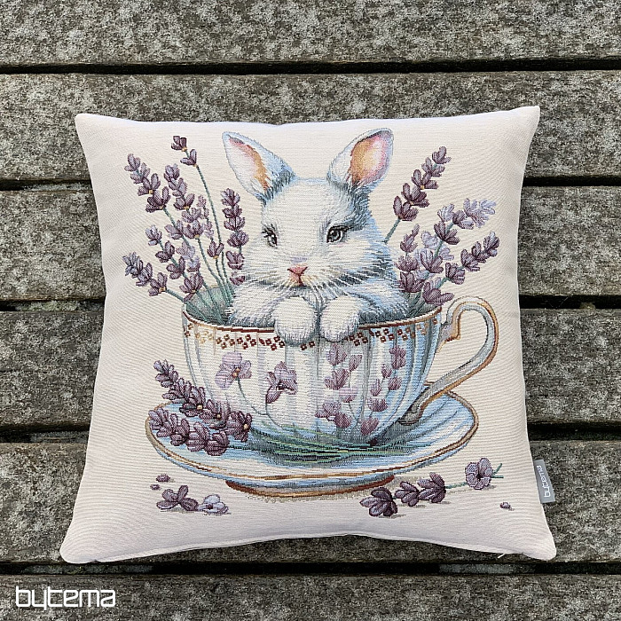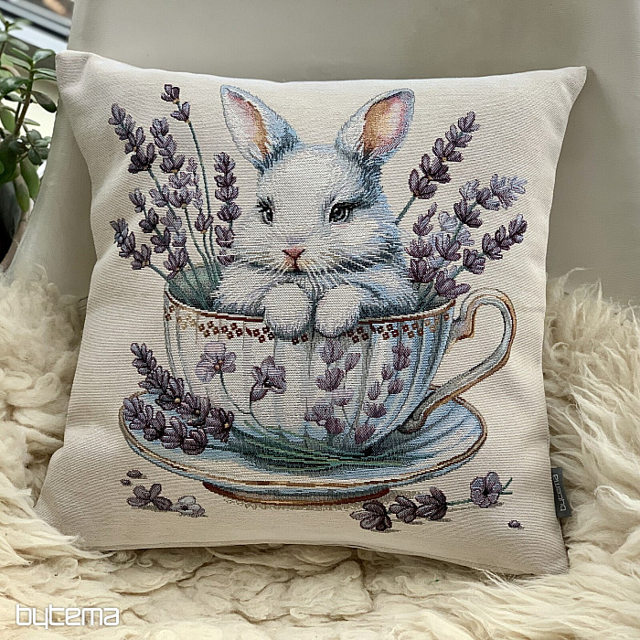 Kissenbezug aus Wandteppich mit einem niedlichen Häschen in einem Porzellanservice, umgeben von duftendem Lavendel. Eine wunderschöne und zarte Dekoration, nicht nur für die Osterzeit.