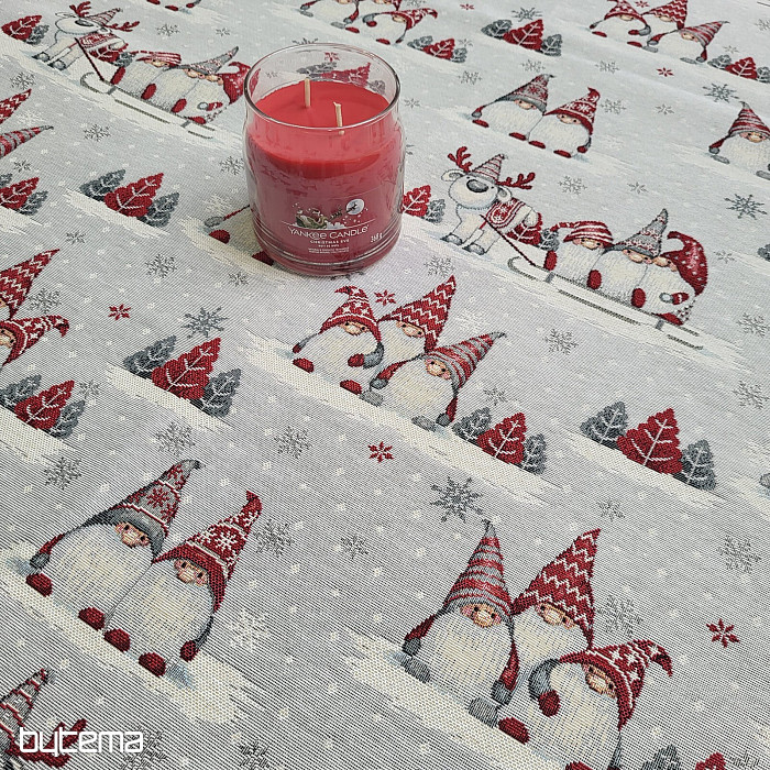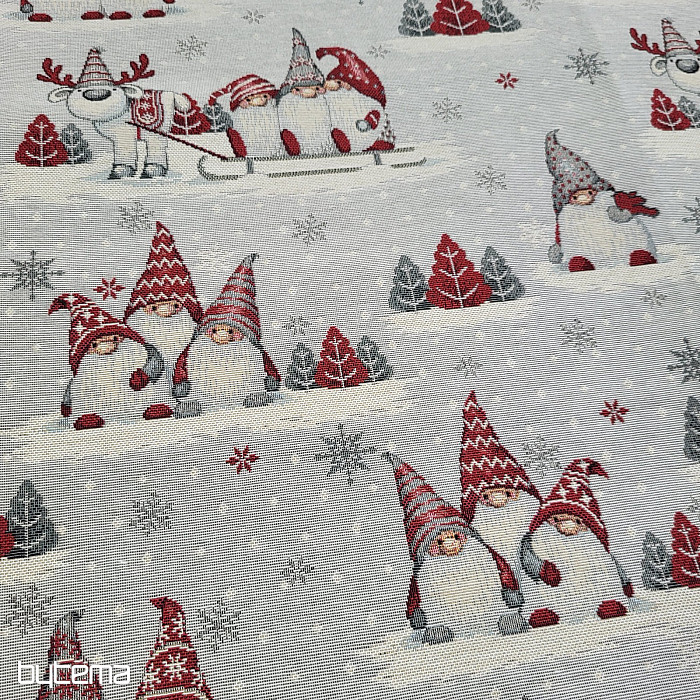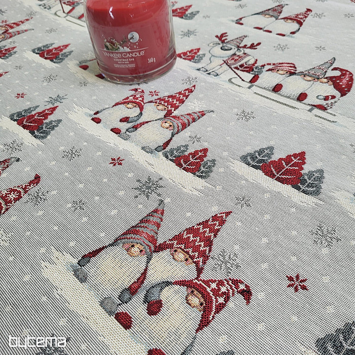 Eine Gobelin-Tischdecke mit einem niedlichen Motiv von Weihnachtselfen schmückt Ihren Weihnachtstisch.