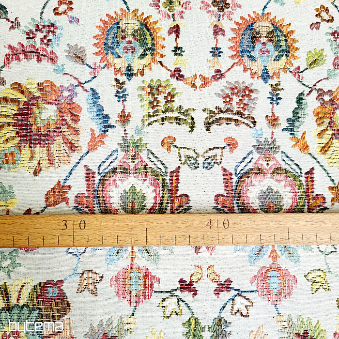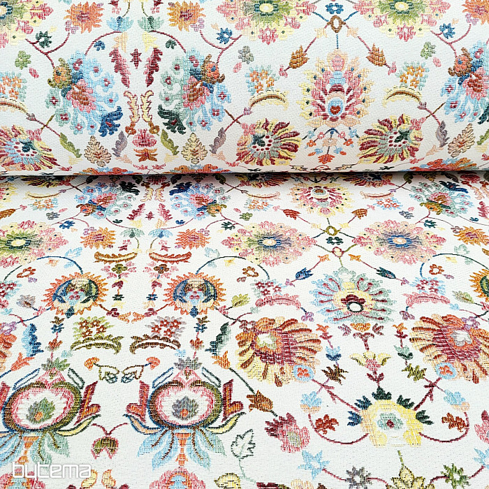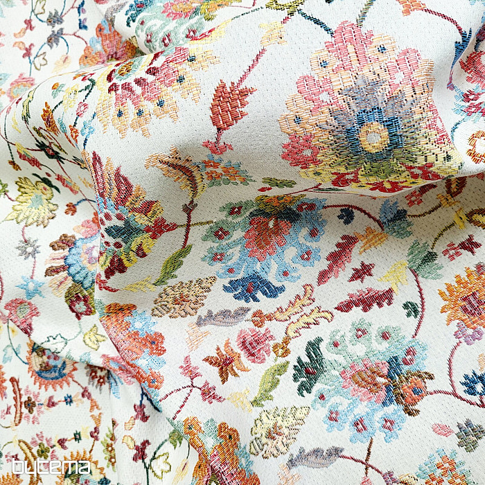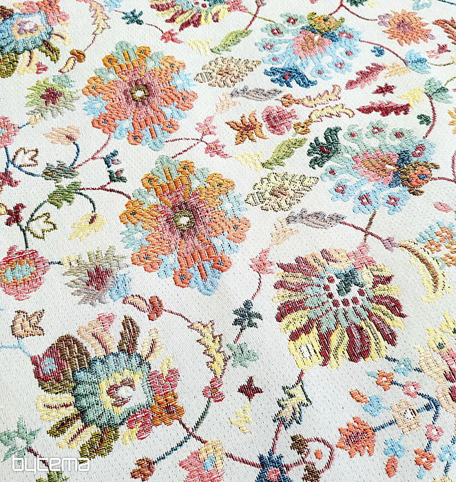 Neu im Sortiment: Wandteppichstoffe mit charakteristischen indischen Blumen, aus denen sich interessante Ornamente gestalten lassen.