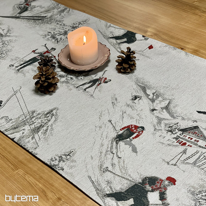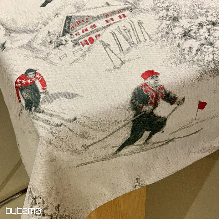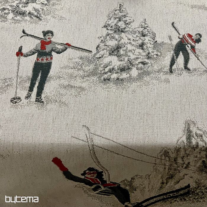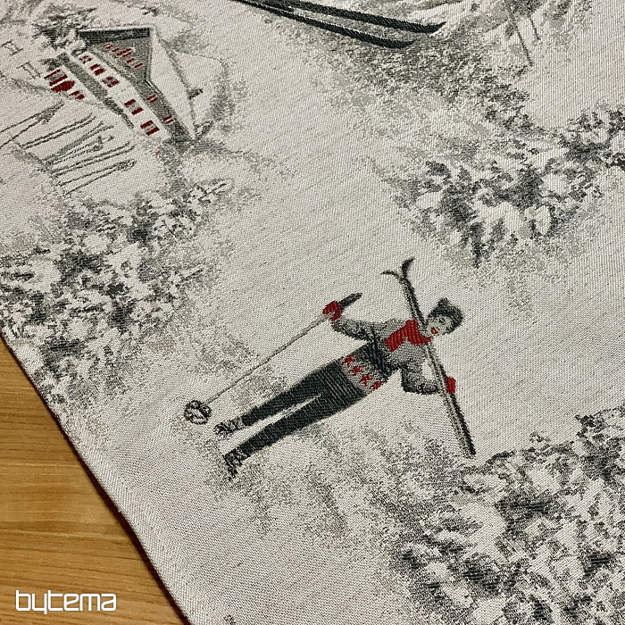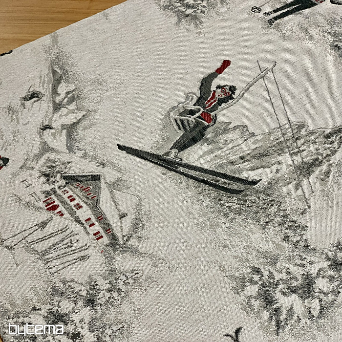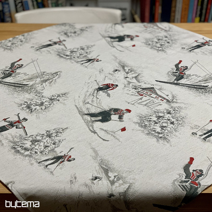 Winterskifahren und alles drumherum ist das Hauptmotiv dieses luxuriösen Stoffes. Es passt wunderbar auf jeden Tisch in Berghütten oder Blockhütten.