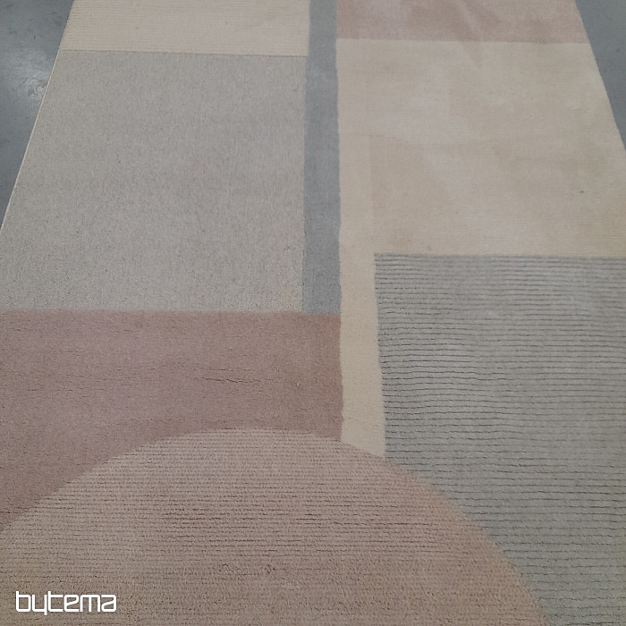 Luxuriöser belgischer Teppich in Pastellfarben mit geometrischen 3D-Mustern. Der plastische Effekt entsteht durch den unterschiedlich angeordneten Flor, der aus Schafwolle besteht. Dies garantiert dem Teppich hohe Widerstandsfähigkeit und Haltbarkeit.