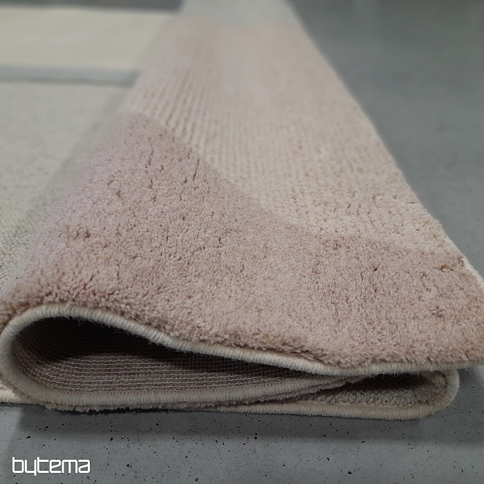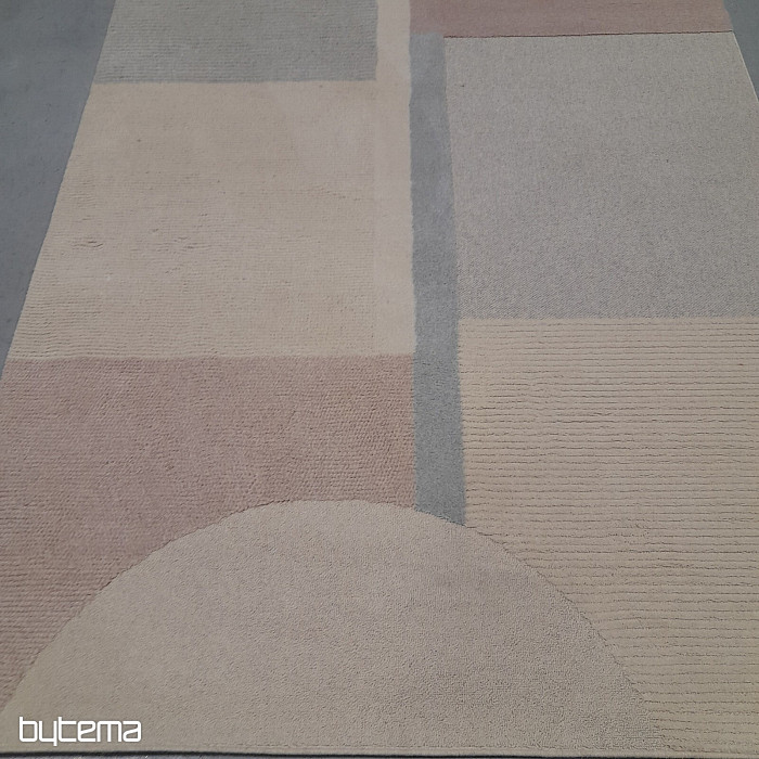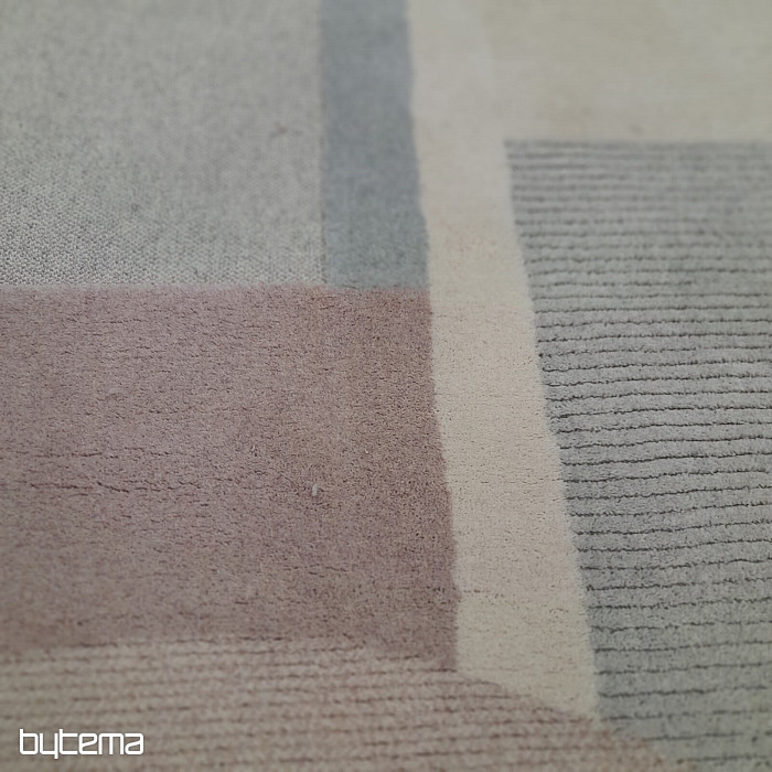 Luxuriöser belgischer Teppich in Pastellfarben mit geometrischen 3D-Mustern. Der plastische Effekt entsteht durch den unterschiedlich angeordneten Flor, der aus Schafwolle besteht. Dies garantiert dem Teppich hohe Widerstandsfähigkeit und Haltbarkeit.