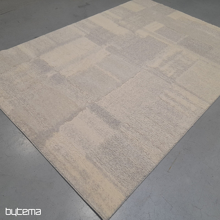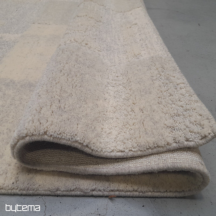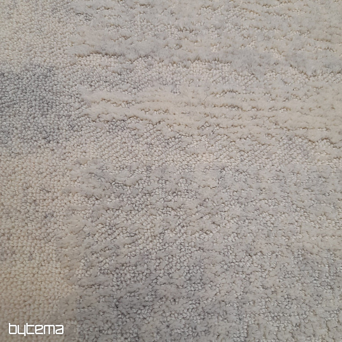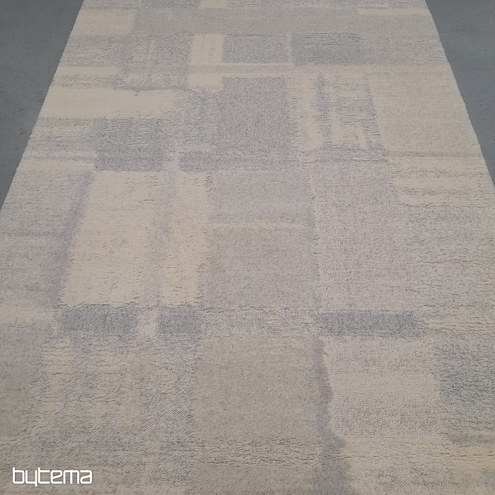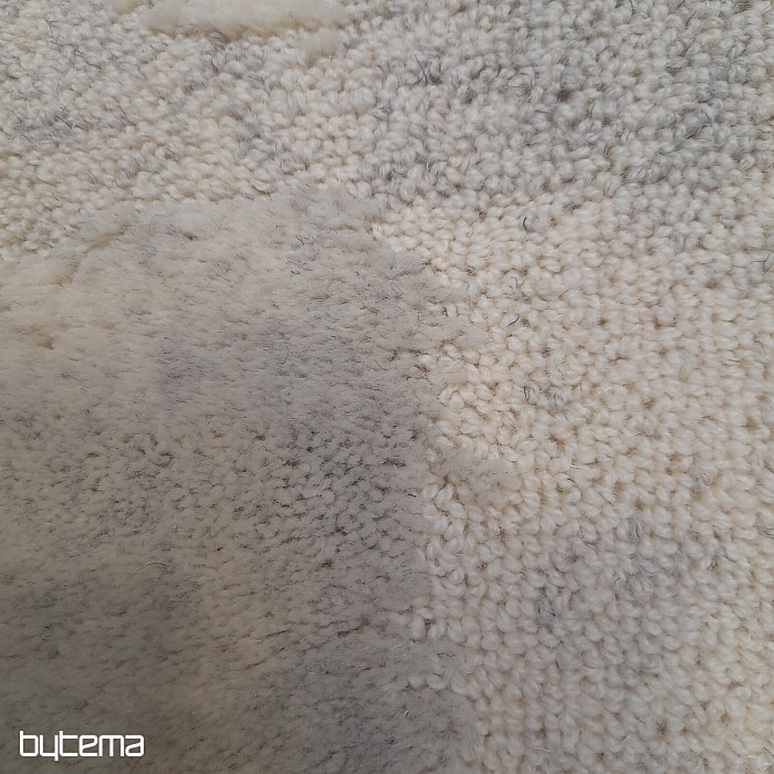 Luxuriöser belgischer Teppich in Pastellfarben mit geometrischen 3D-Mustern. Der plastische Effekt entsteht durch den unterschiedlich angeordneten Flor, der aus Schafwolle besteht. Dies garantiert dem Teppich hohe Widerstandsfähigkeit und Haltbarkeit.