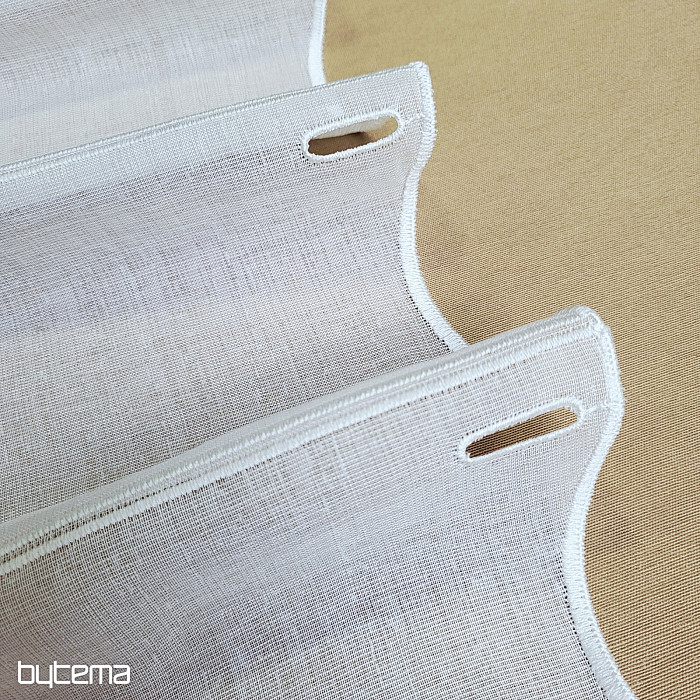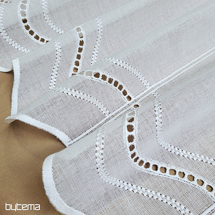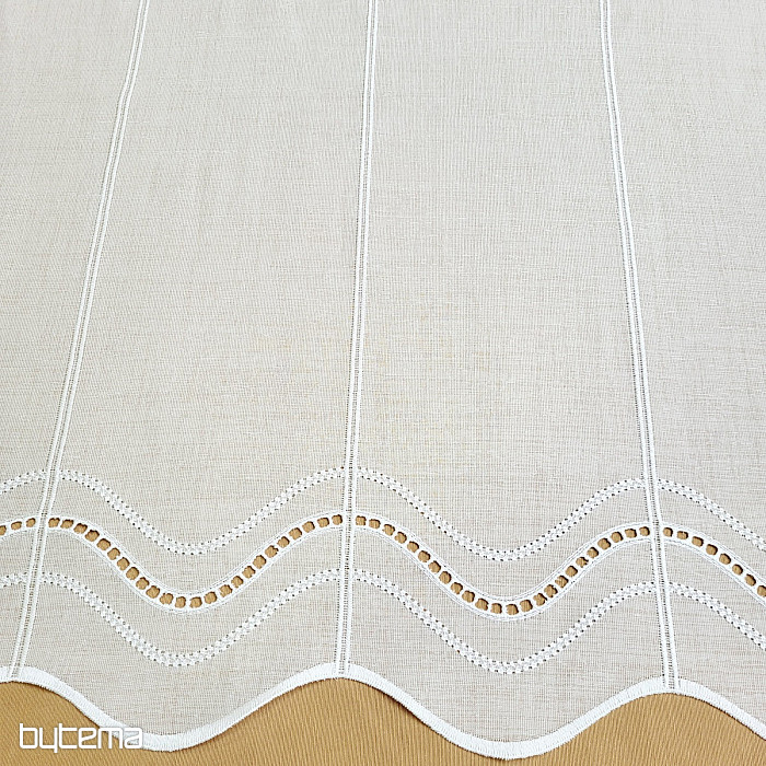 Moderner, schlichter Stickvorhang für Buntglasfenster. Kein Nähen erforderlich, da er in ca. 15 cm breiten Sticklinien zugeschnitten ist. Das Material hat eine natürliche bis weiche Leinenoptik.