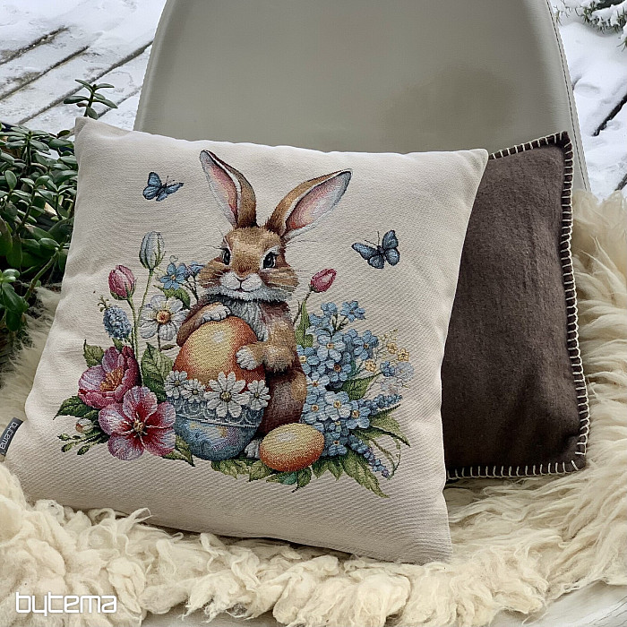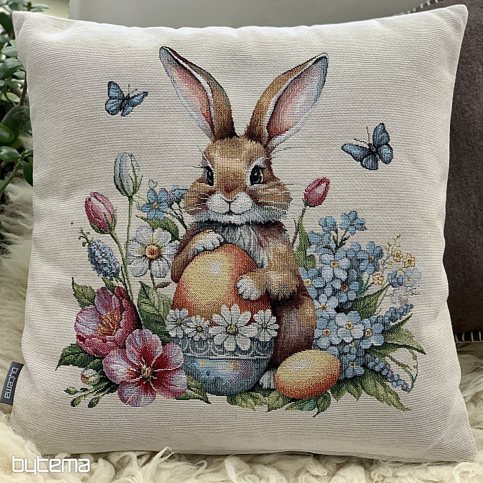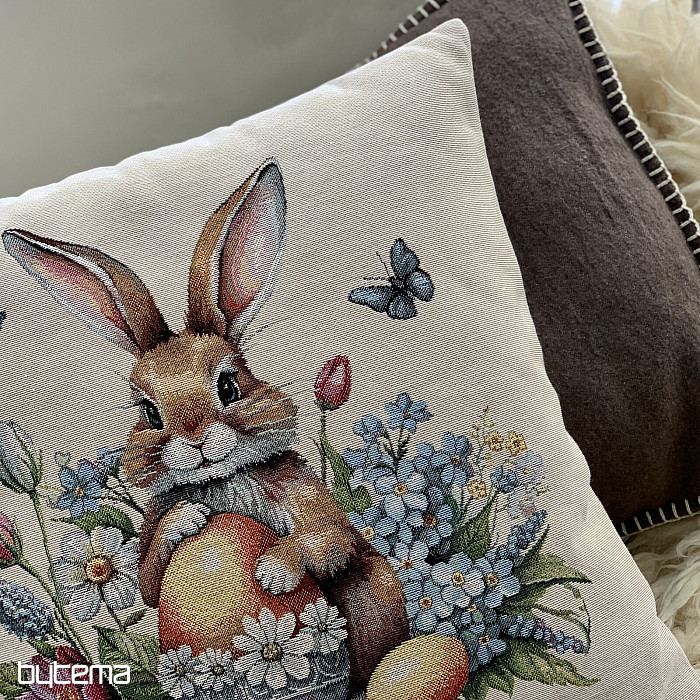 Ein Gobelin mit einem niedlichen Hasen und vielen Frühlingsblumen bringt garantiert Osterstimmung in Ihr Zuhause.