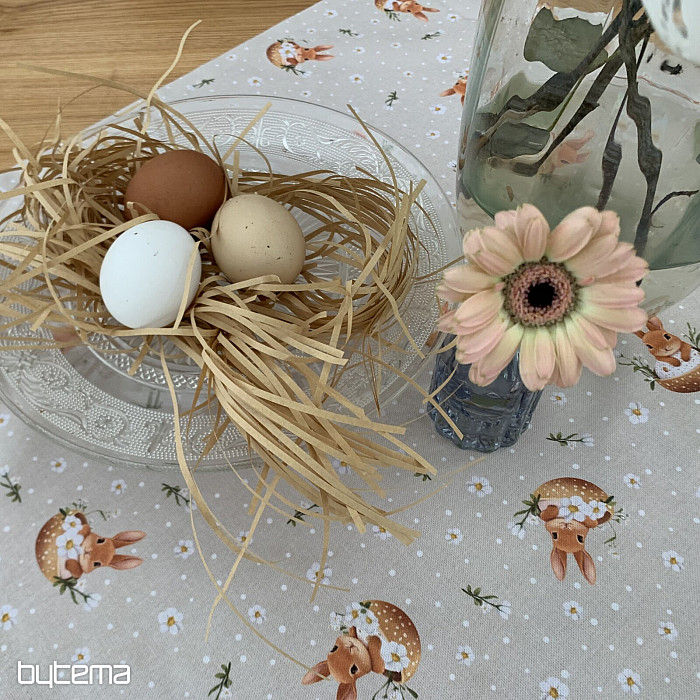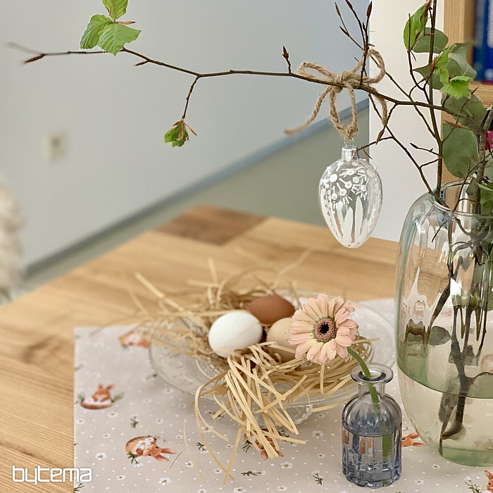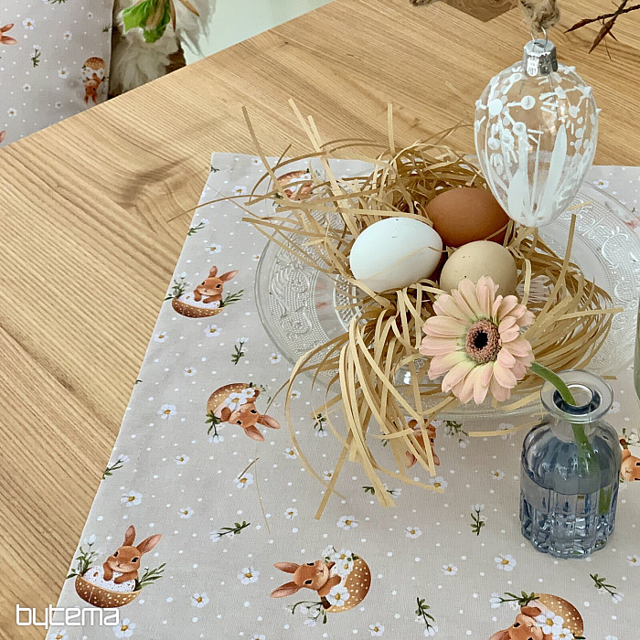 Ostertischdecke oder -schal mit einem in einer Eierschale versteckten Häschen. Eine wunderschöne und niedliche Frühlingsdekoration für Zuhause.