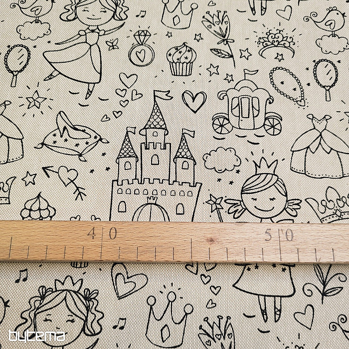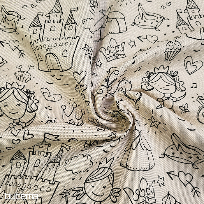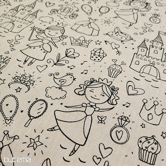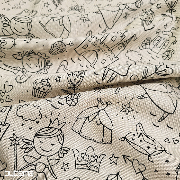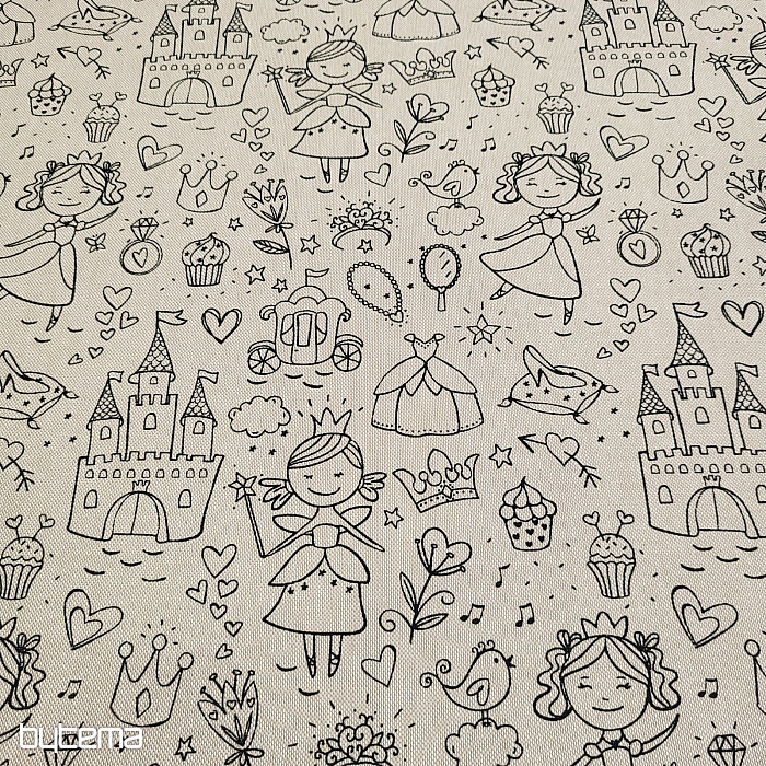 Wunderschöne Baumwollstoffe für kreative Projekte Ihrer Kleinen. Die Motive auf dem Stoff können mit Textilmarkern ausgemalt werden. Das Muster befindet sich auf hellgrauem Hintergrund, wodurch das ausgemalte Bild noch schöner zur Geltung kommt.
