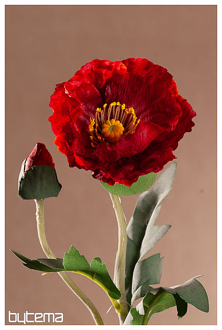 Eine Mohnblume mit roter Blüte und einer Knospe. Sie trägt mehrere Blätter an einem 69 cm langen Stiel. Aufgrund ihrer Verarbeitung kann die Blume leicht mit der echten Mohnblume verwechselt werden, die auf Wiesen und Feldern wächst.