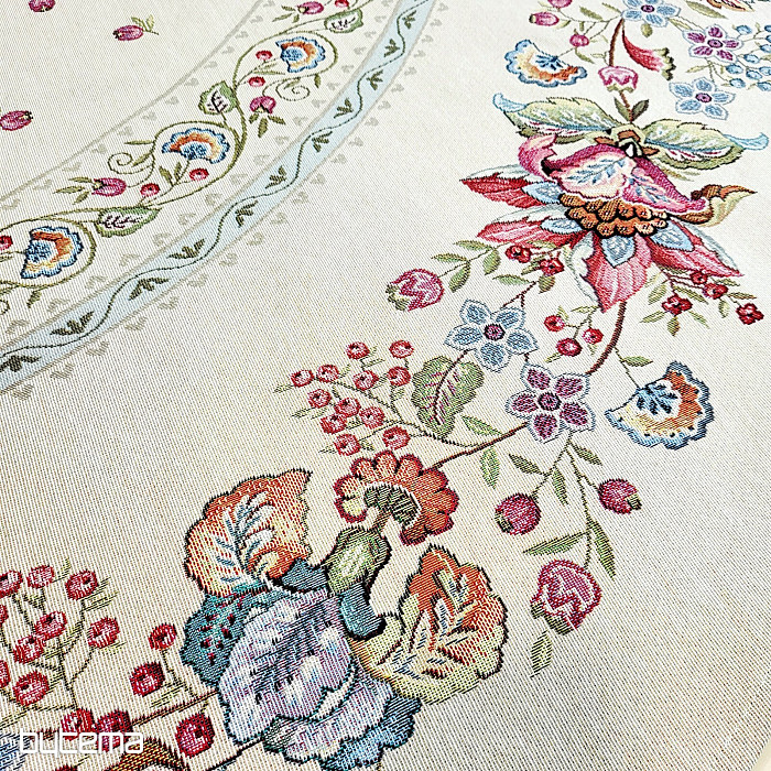 Eine runde Tischdecke mit aufgemalten Blumen. Schönheit und Zartheit in jedem Detail.