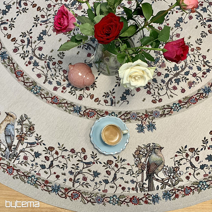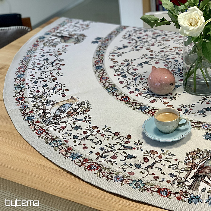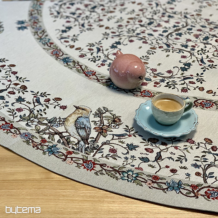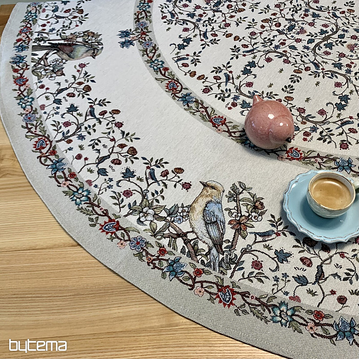 Eine wunderschöne, runde Tischdecke aus robustem Gobelinstoff mit Vögeln und Blumen in verschiedenen Farben. Ein perfektes Accessoire oder Geschenk für Vogelliebhaber.