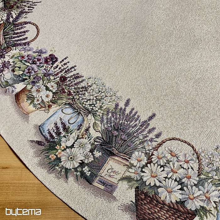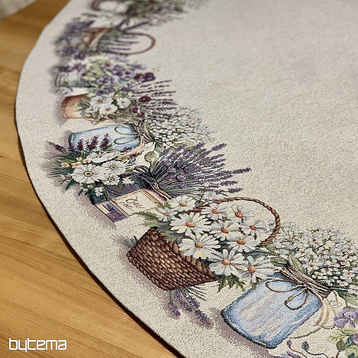 Eine wunderschöne runde Tischdecke aus festem Gobelinstoff mit einem Blumenmuster, die Ihrem Zuhause Schönheit verleihen wird.
