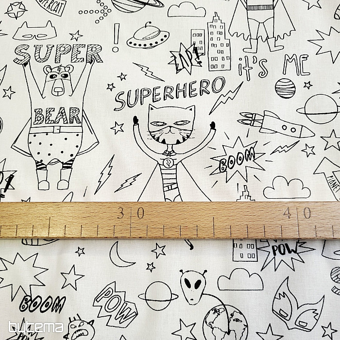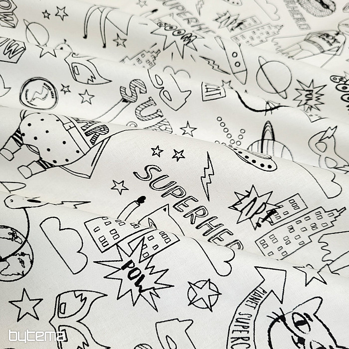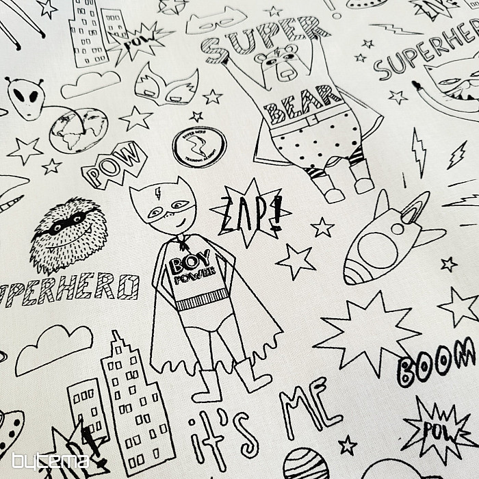 Ein Stoff zum Bemalen mit modernen Superhelden. Ein Muster, das Kinder nach ihrer Fantasie selbst ausmalen können.