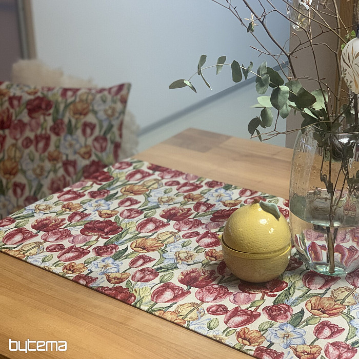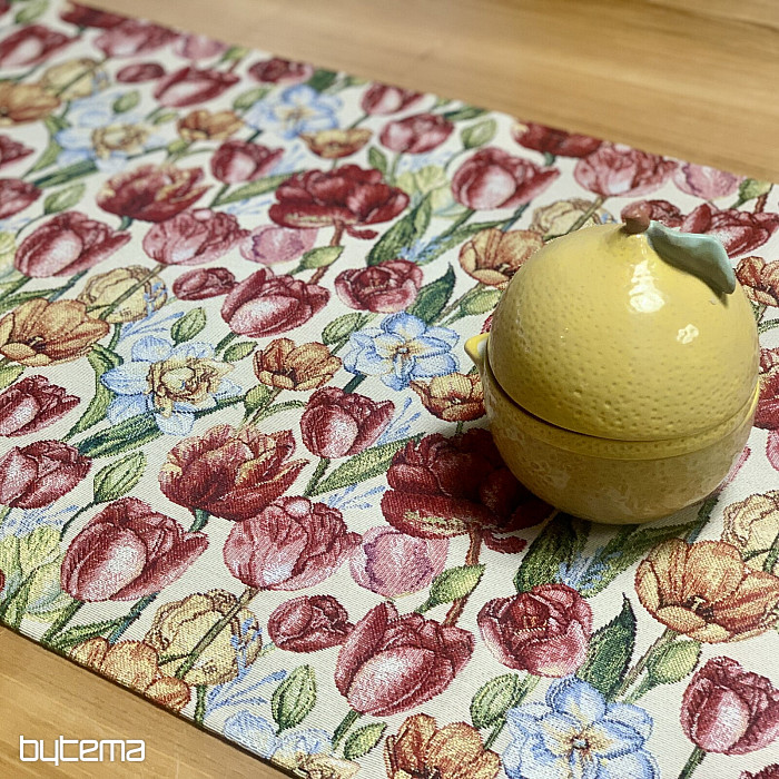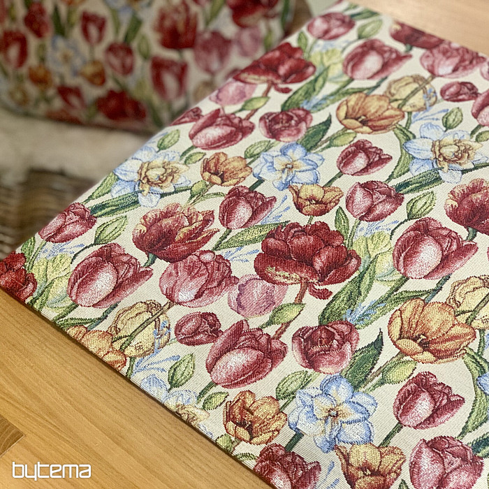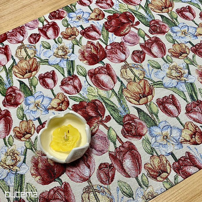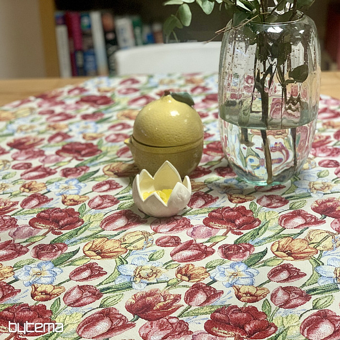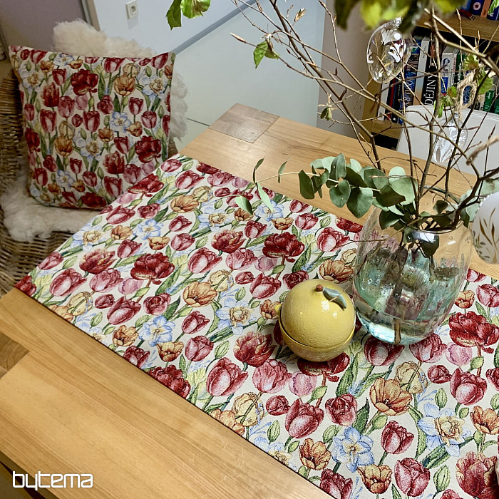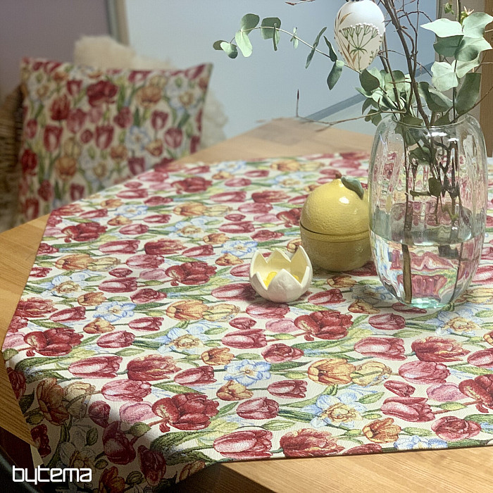 Eine wunderschöne Tischdecke und ein passender Schal mit Frühlingsblumen wie Tulpen und Narzissen. Ein herrlicher, farbenfroher Frühlingszauber für Ihr Zuhause. Passende Kissenbezüge sind ebenfalls erhältlich.