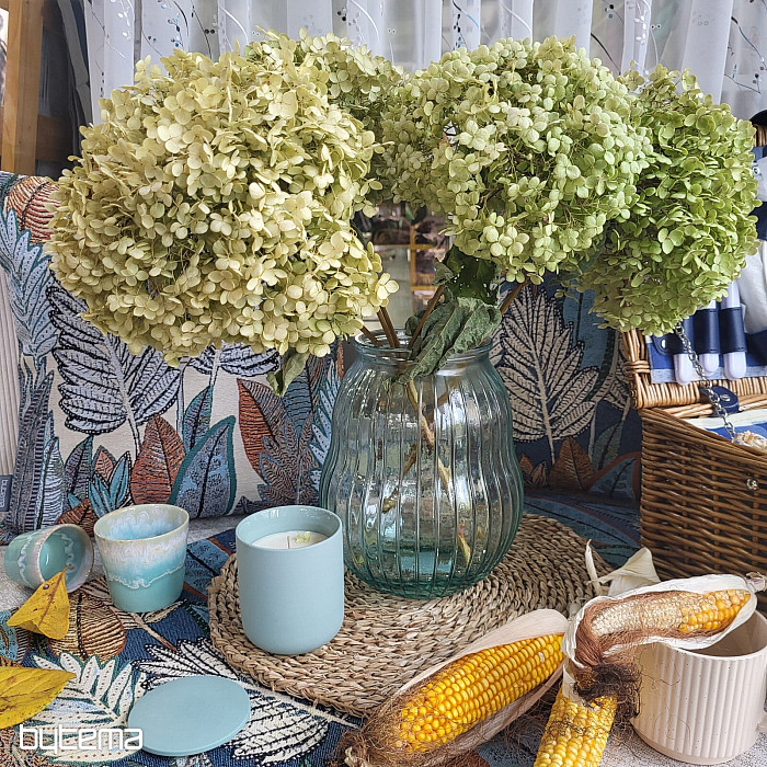 Die Klarglasvase ALBANIA mit einem saisonalen Blumenstrauß ist eine einzigartige Dekoration auf Ihrem Esstisch oder in der Pergola.
