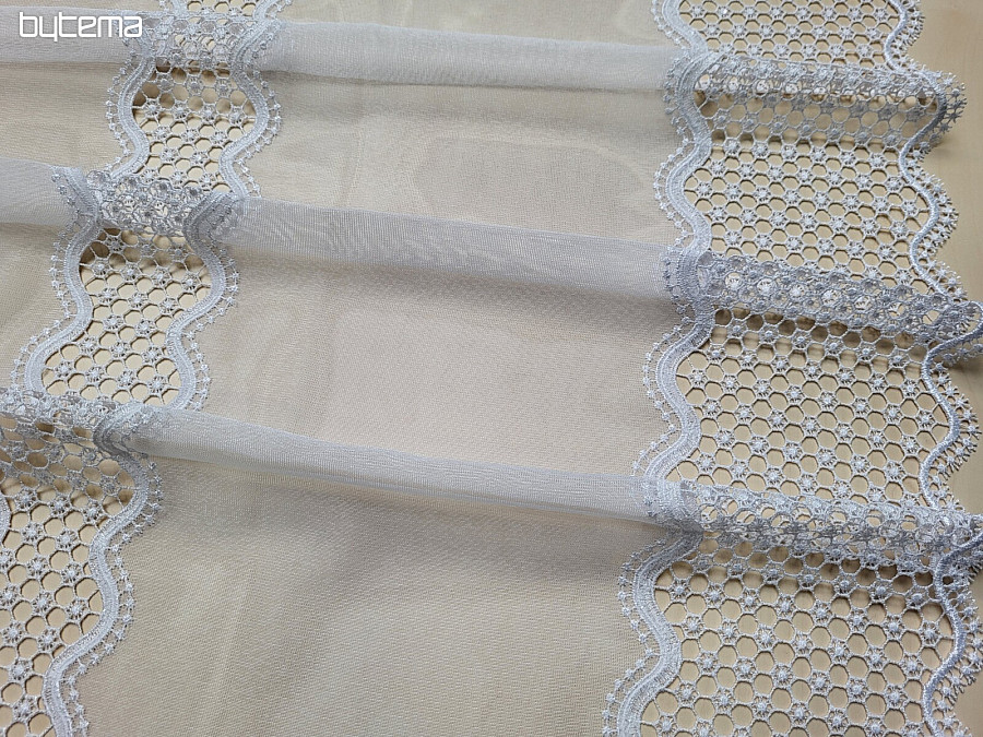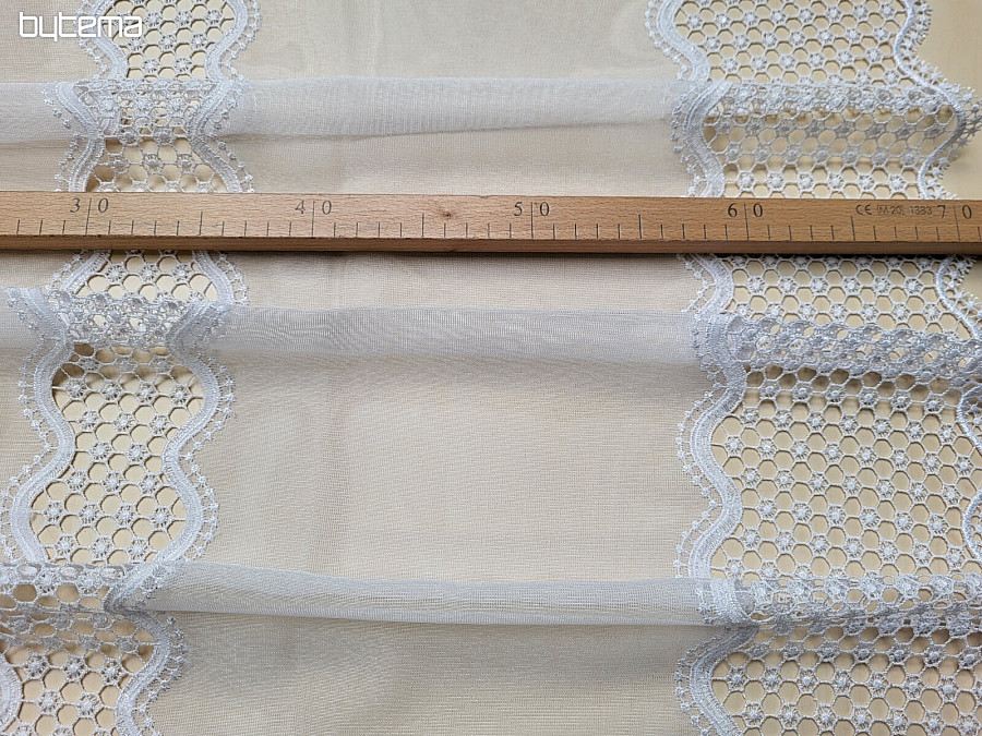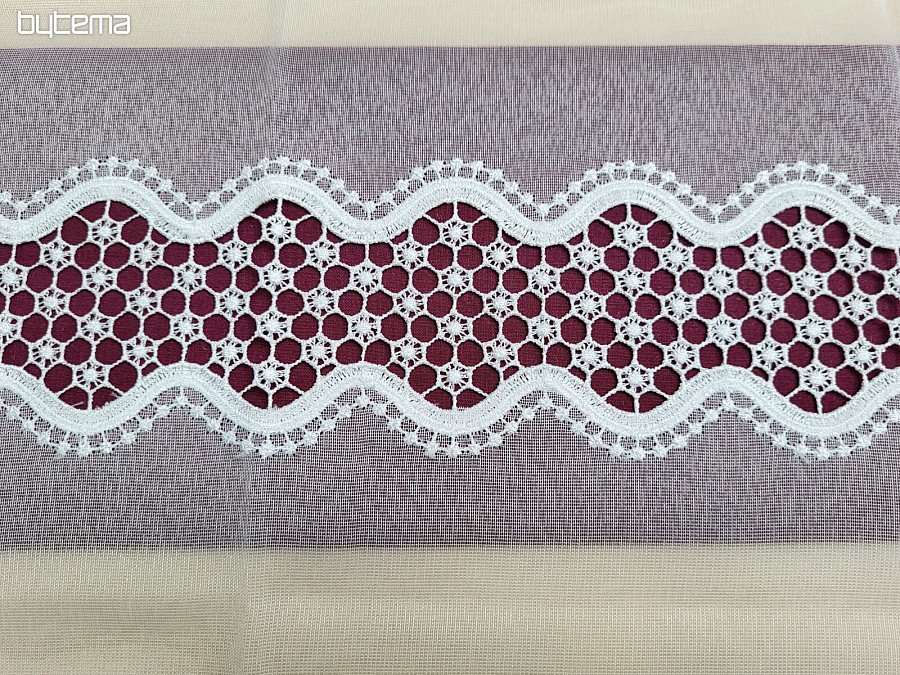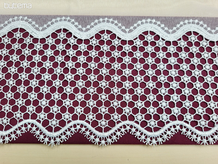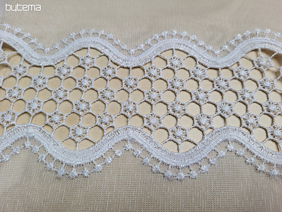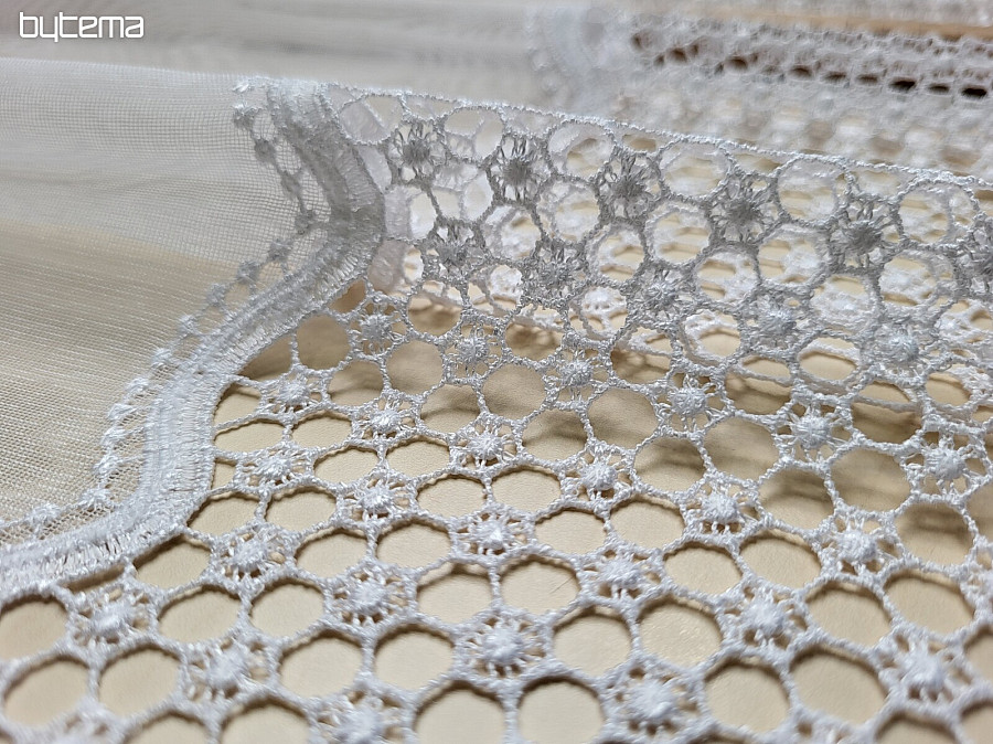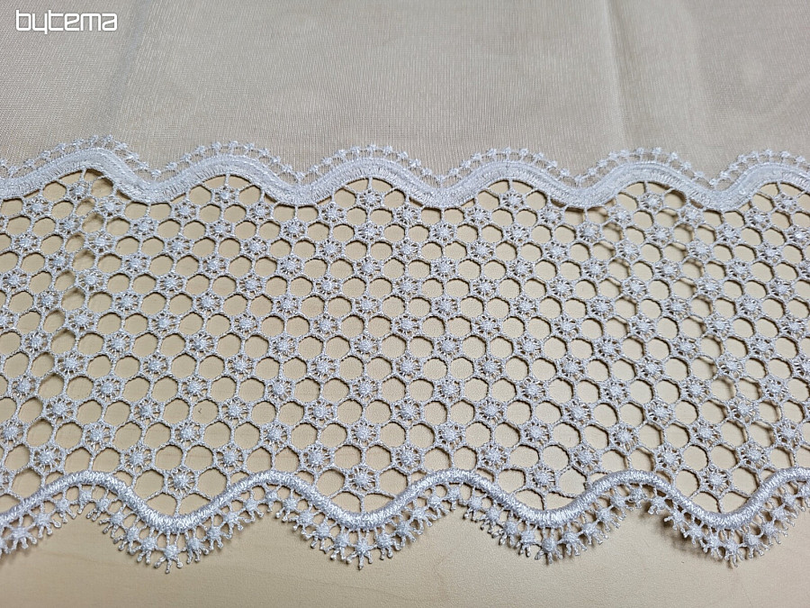 Ein wunderschöner Vorhang aus gewebtem Voile mit Makramee-Muster in der Farbe Weiß ist in den Längen 180 cm und 250 cm erhältlich.