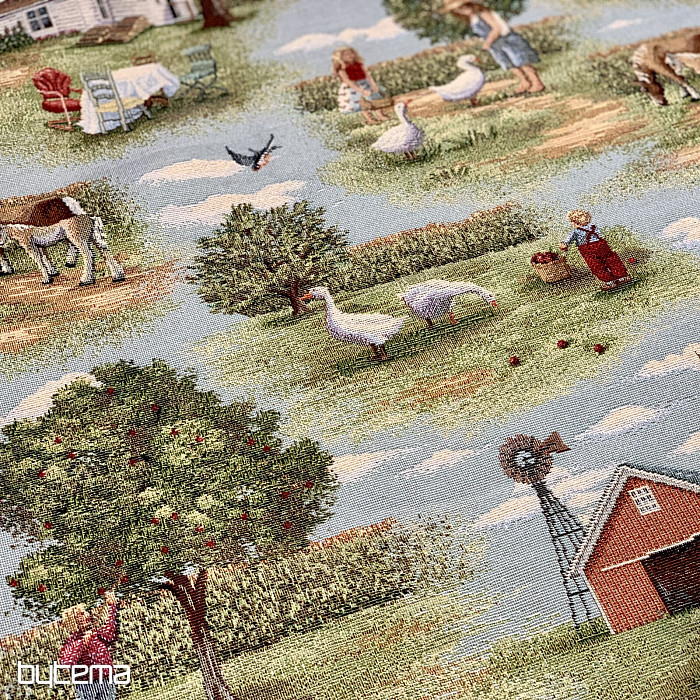 Ein hochwertiger Wandteppichstoff mit einem wunderschönen Motiv des ländlichen Lebens wird jedem Zuhause Freude bereiten.