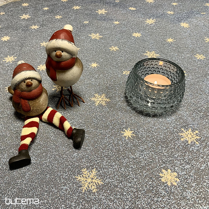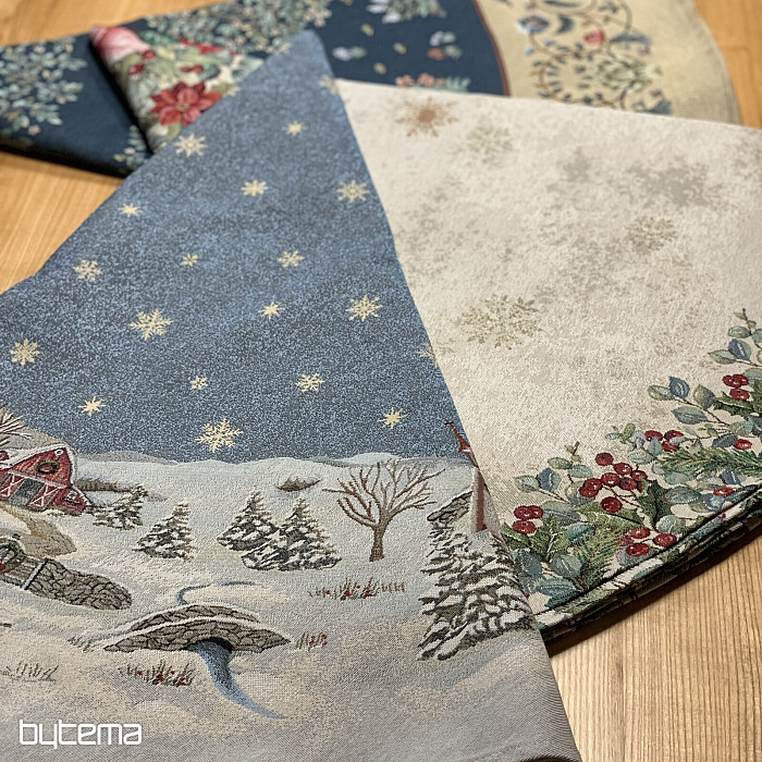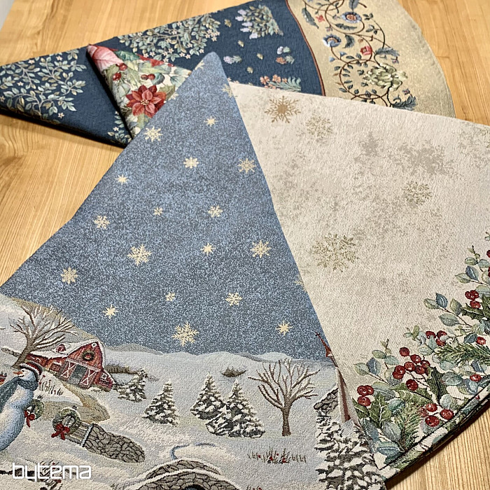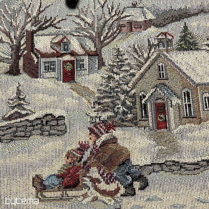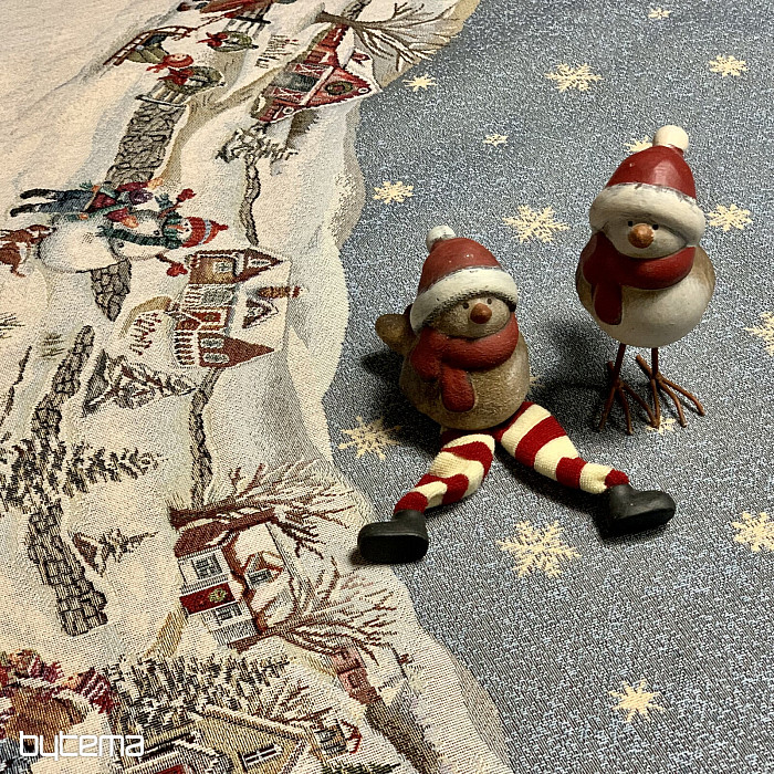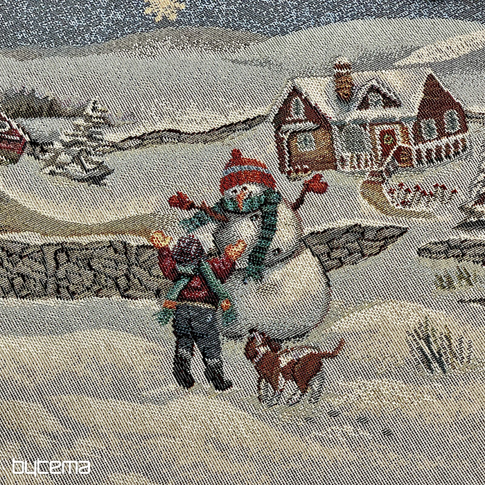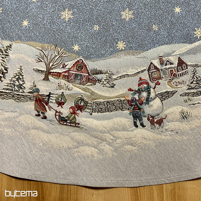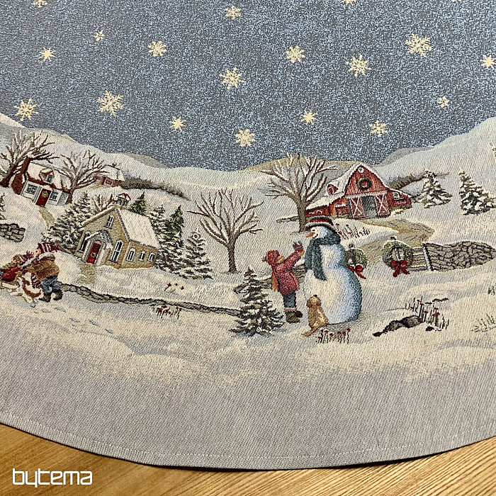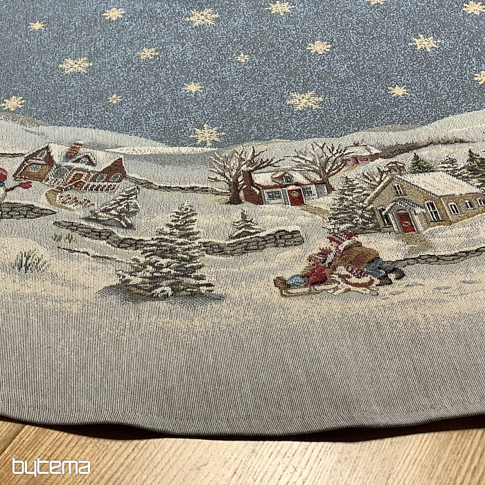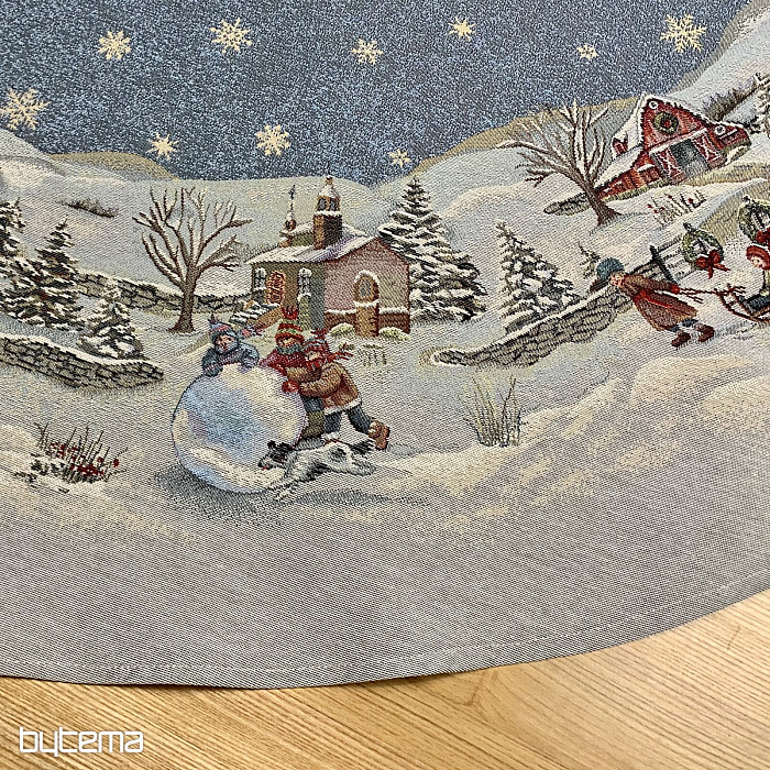 Eine wunderschöne, runde Tischdecke aus Wandteppichstoff mit einem perfekten Wintermotiv, das kindliche Weihnachtsfreude ausstrahlt.