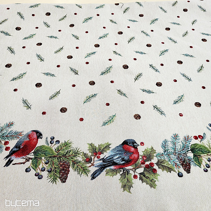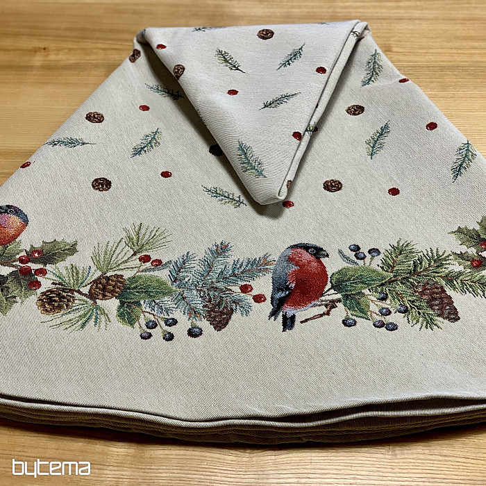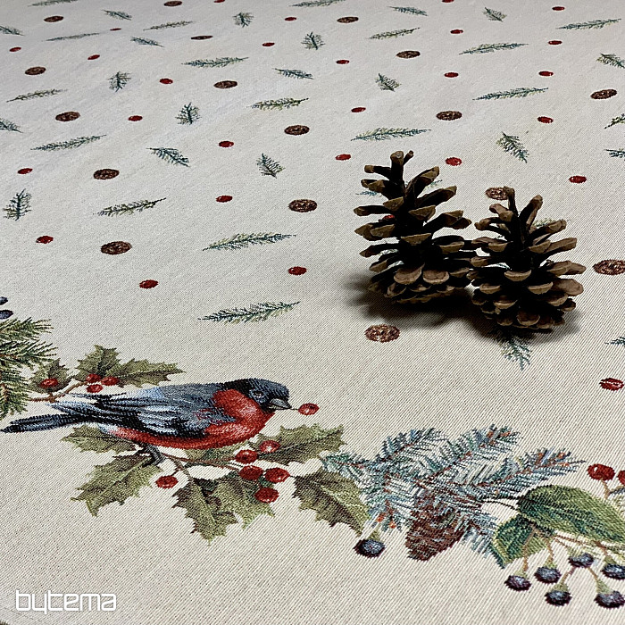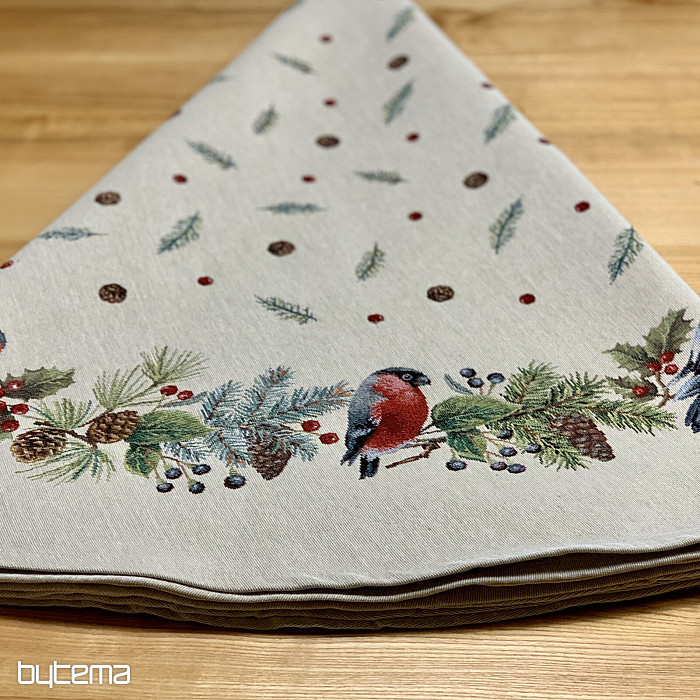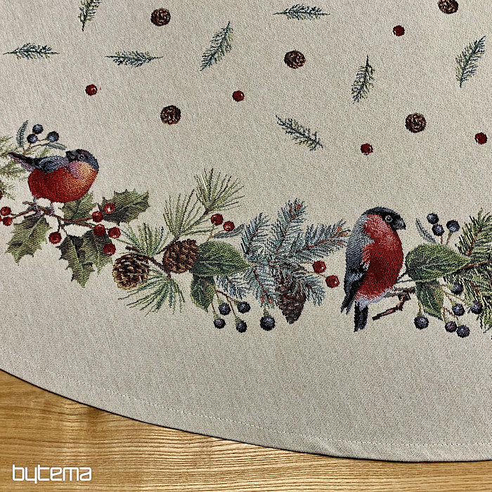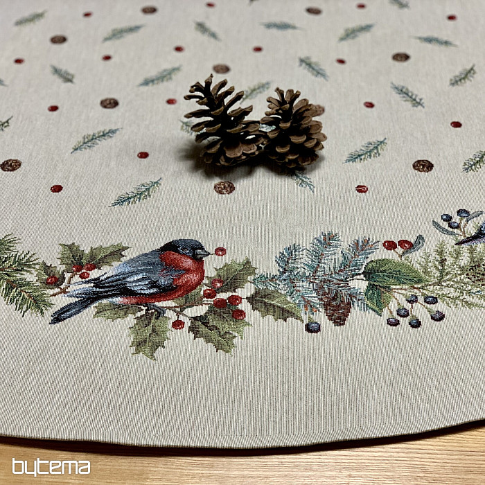 Runde Weihnachtstischdecke aus Gobelinstoff mit einem winterlichen Vogelmotiv – einem Gimpel. Verwenden Sie diese Tischdecke gerne als Weihnachtsdekoration.