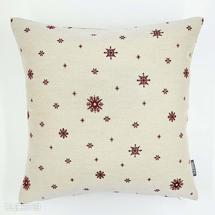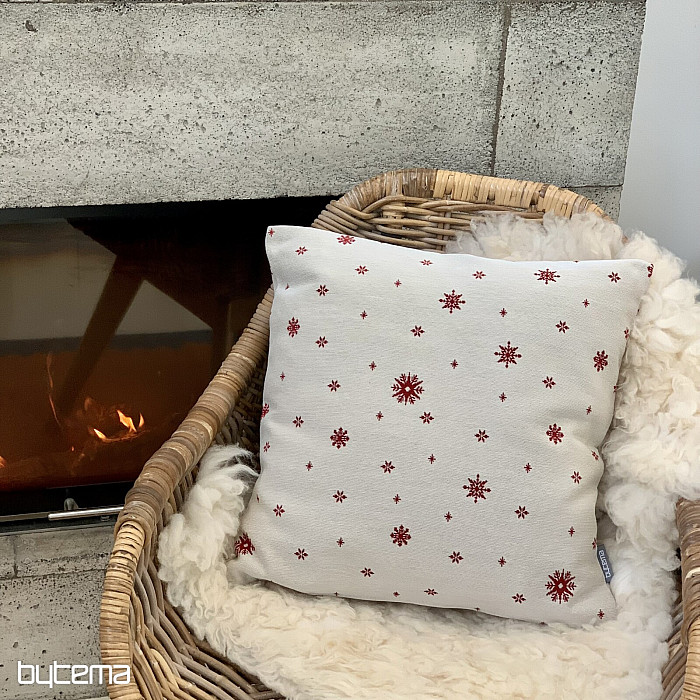 Ein Gobelinbezug mit einem Design aus zarten roten Schneeflocken bringt wahren Weihnachtszauber in Ihr Zuhause.