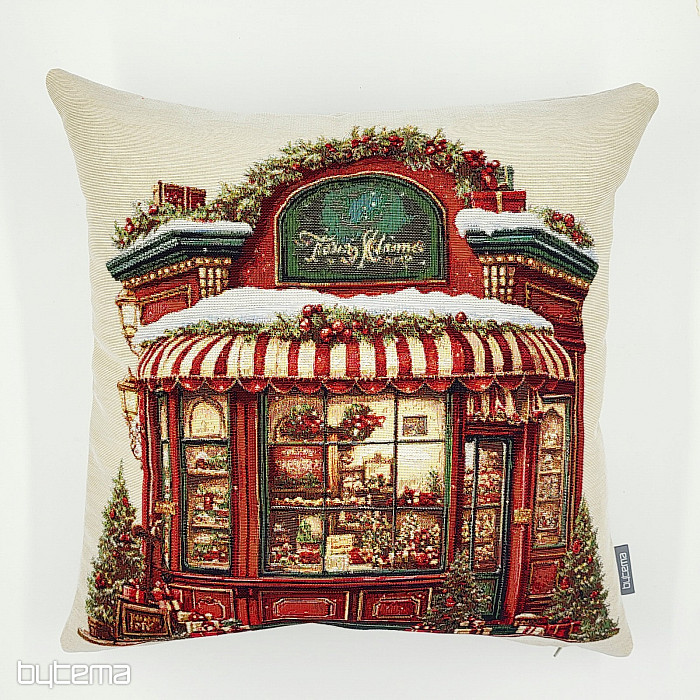 Wandteppich mit dem Motiv eines weihnachtlich geschmückten Schaufensters in einer belebten Straße. Ein wunderschönes Weihnachtsaccessoire für Ihr Zuhause.