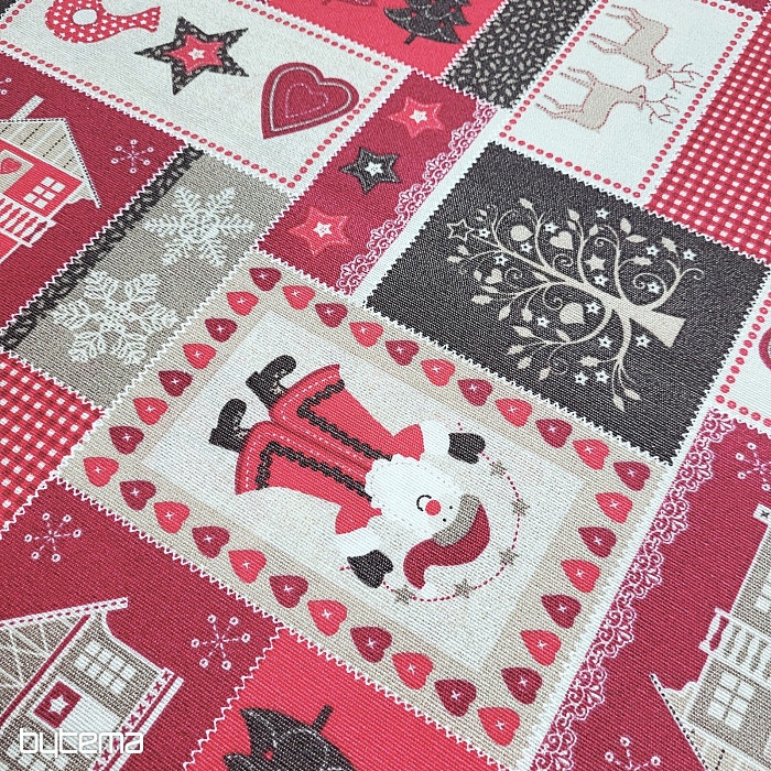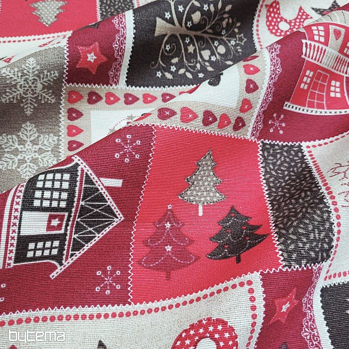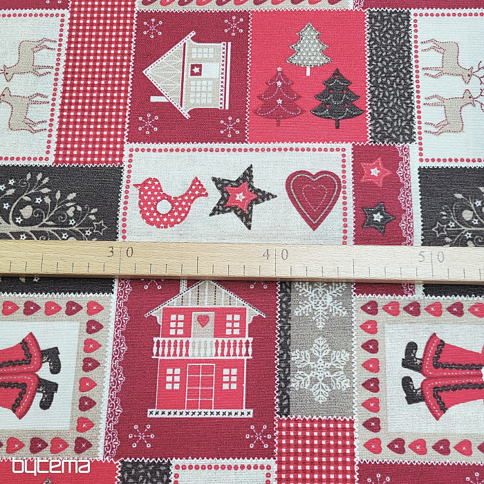 Dekorativer Stoff mit weihnachtlichem Patchwork-Muster, geeignet für Interieurs im rustikalen und ländlichen Stil.