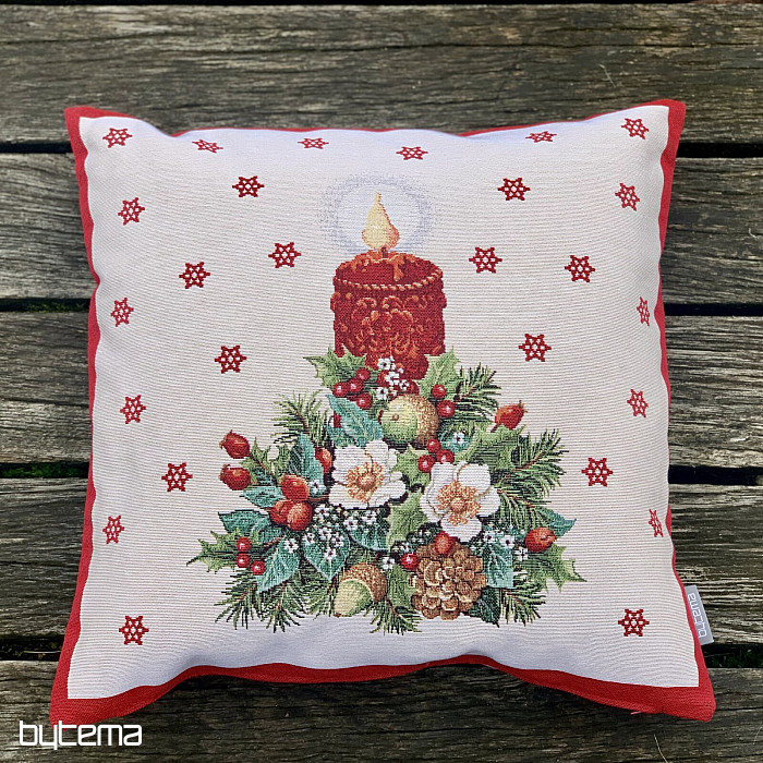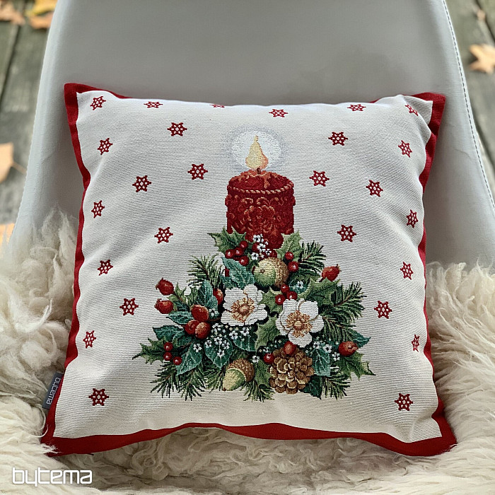 Ein Kissenbezug mit weihnachtlichem Wandteppichmuster und einer schönen brennenden Kerze bringt festliche Wärme in Ihr Zuhause.