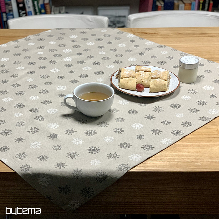 Weihnachtsdeko-Tischdecken und -Schals mit einem Muster aus wunderschönen großen und kleinen weißen und grauen Schneeflocken auf rotem Hintergrund werden eine zauberhafte Dekoration in Ihrem Zuhause sein.