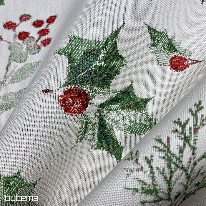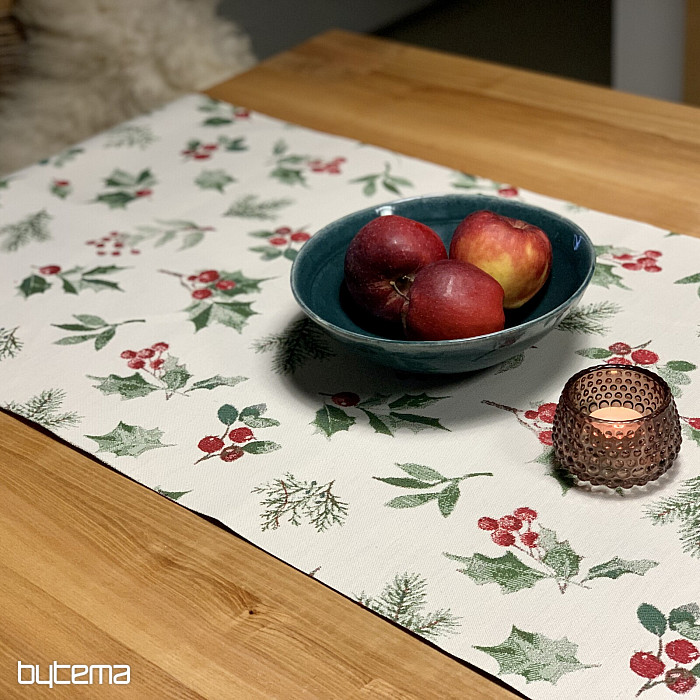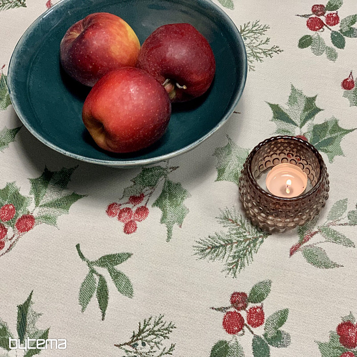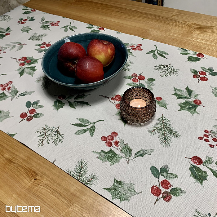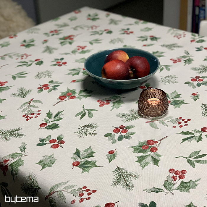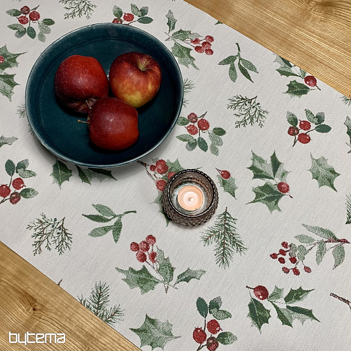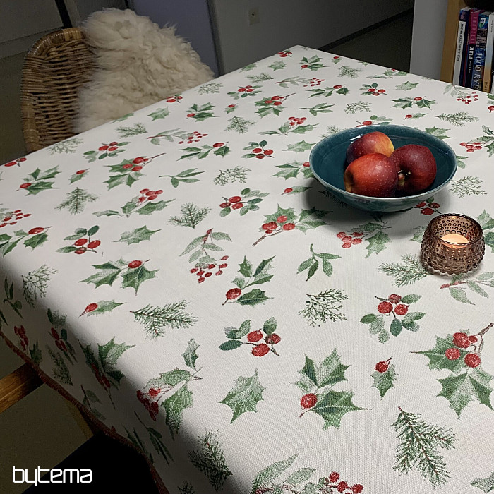 Eine weihnachtliche Tischdecke oder ein Schal aus luxuriösem Stoff mit Stechpalmenzweigen und roten Beeren, die ein Symbol für Weihnachten sind und sich für alle Interieurs eignen, insbesondere in der kälteren Jahreszeit.